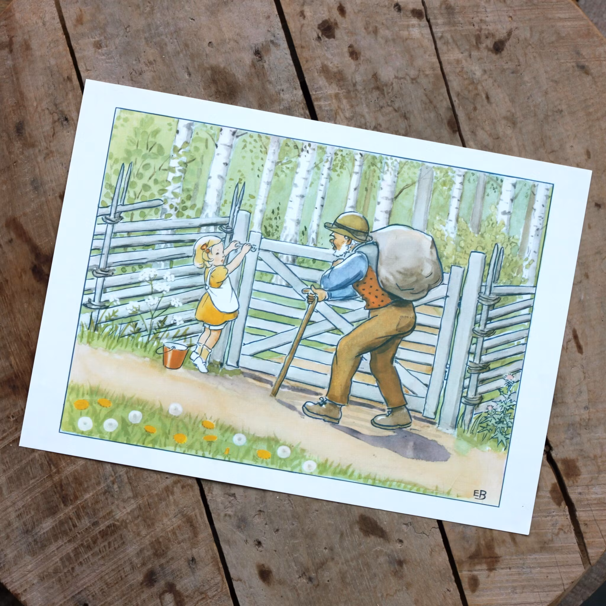 Barnkammarbilder, motiv av våra mest välkända tecknare inom genren. Just denna bild är tecknad av Elsa Beskow. Bilden kommer från en bok och kan ha text, noter eller andra bilder på baksidan. Pappret är lite tjockare, mått ungefär 28 x 20cm. Bilderna är väldigt fina inramade eller fästa på ett lite tjockare papper och upphängda med en klämma på snöre tillsammans mad andra fina bilder och småsaker.