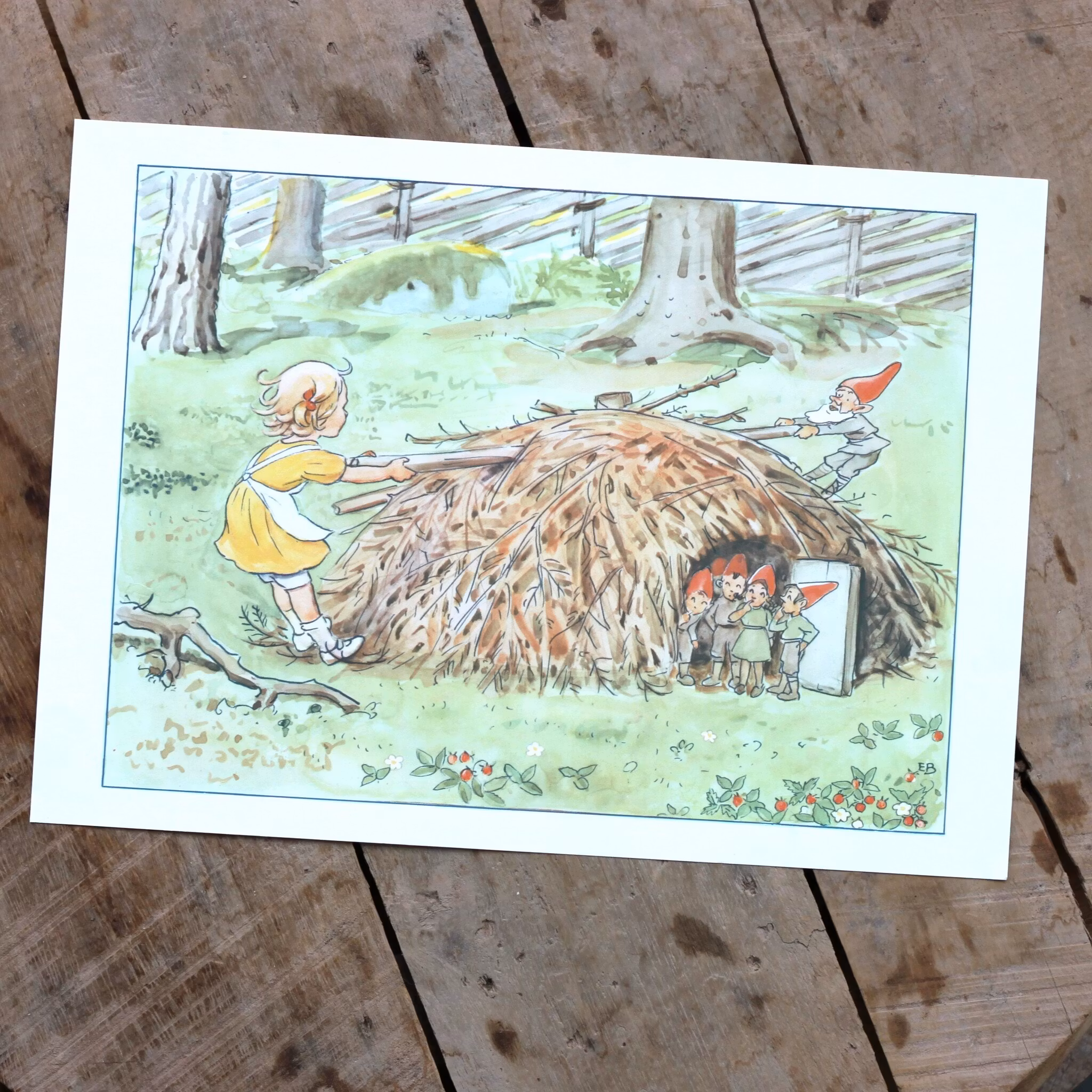 Barnkammarbilder, motiv av våra mest välkända tecknare inom genren. Just denna bild är tecknad av Elsa Beskow. Bilden kommer från en bok och kan ha text, noter eller andra bilder på baksidan. Pappret är lite tjockare, mått ungefär 28 x 20cm. Bilderna är väldigt fina inramade eller fästa på ett lite tjockare papper och upphängda med en klämma på snöre tillsammans mad andra fina bilder och småsaker.