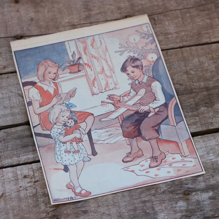 Barnkammarbilder, motiv av våra mest välkända tecknare inom genren. Vi har fått in ett helt parti såna här bilder och själva motivet är cirka16cm höga och 15cm breda, några kan vara någon centimeter större eller mindre. Bilderna är av tidningspapper, har text på baksidan och har suttit på omslag till en barntidning från 40:talet. Bilderna är väldigt fina inramade eller fästa på ett lite tjockare papper och upphängda med en klämma på snöre tillsammans mad andra fina bilder och småsaker.