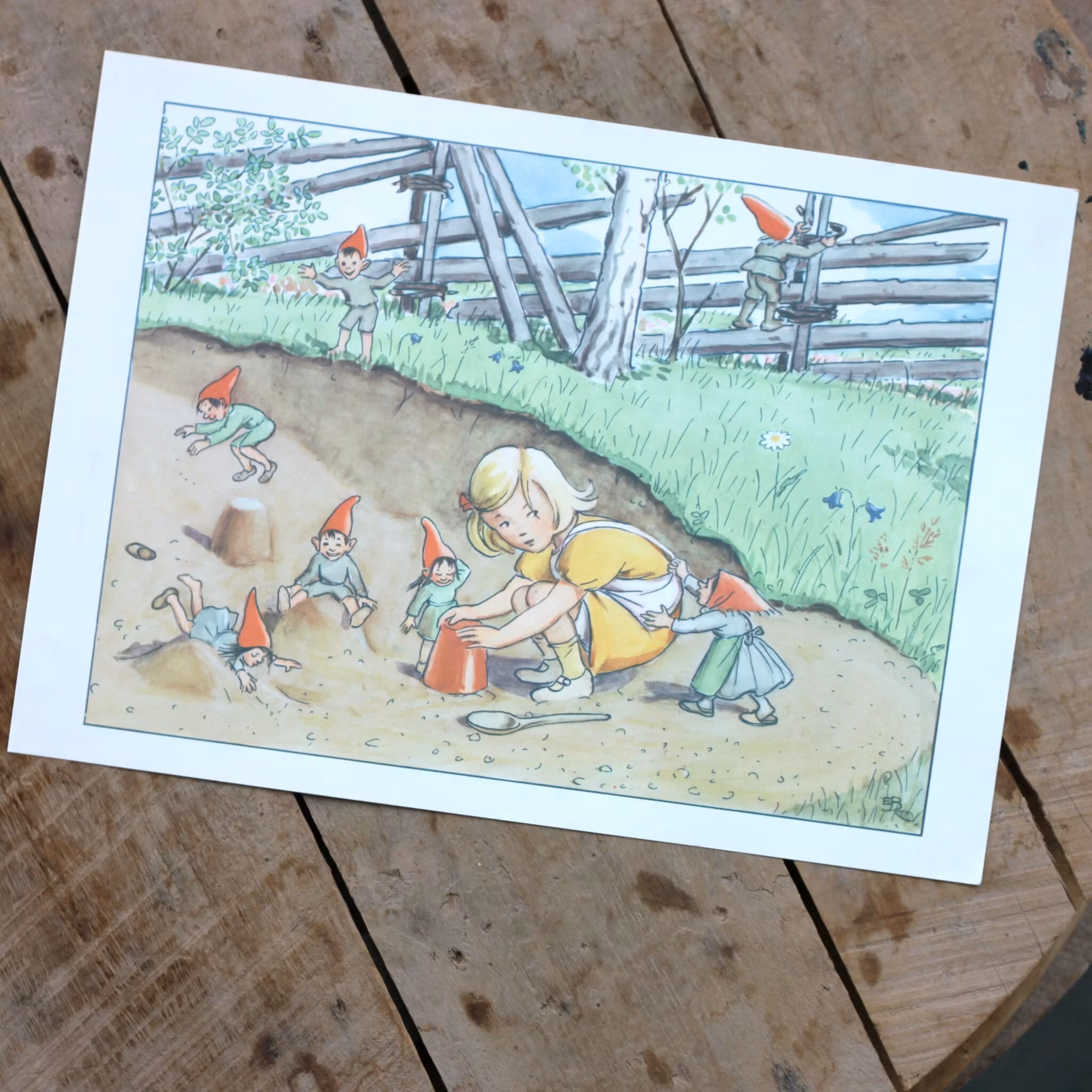Barnkammarbilder, motiv av våra mest välkända tecknare inom genren. Just denna bild är tecknad av Elsa Beskow. Bilden kommer från en bok och kan ha text, noter eller andra bilder på baksidan. Pappret är lite tjockare, mått ungefär 28 x 20cm. Bilderna är väldigt fina inramade eller fästa på ett lite tjockare papper och upphängda med en klämma på snöre tillsammans mad andra fina bilder och småsaker.