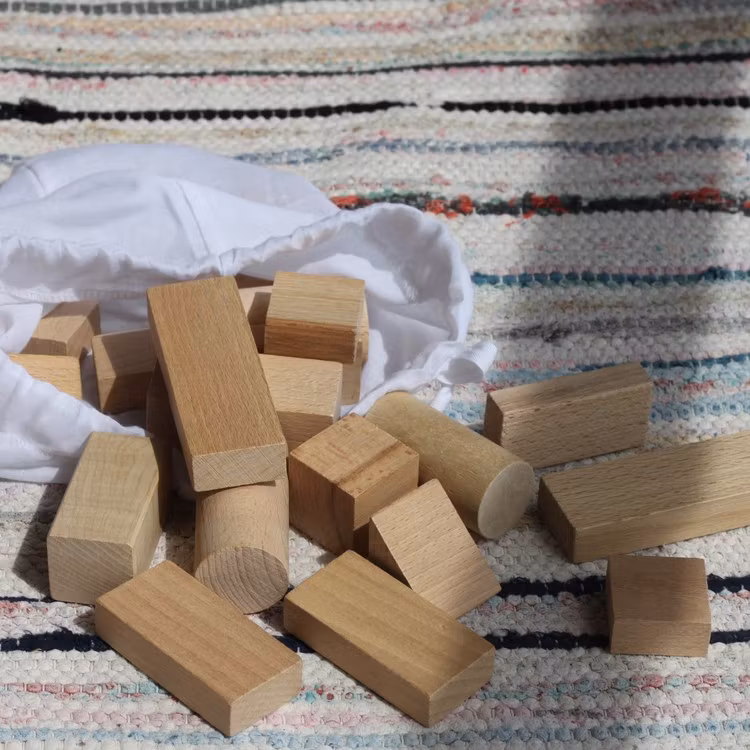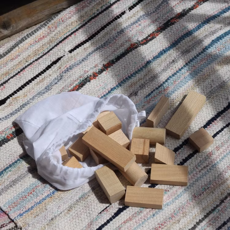 Klassiska träfärgade/omålade träklossar att bygga precis vad som helst av. Det ligger ca. 20 klossar i påsen. Påsen är av bomull och kan enkelt köras i tvättmaskinen.