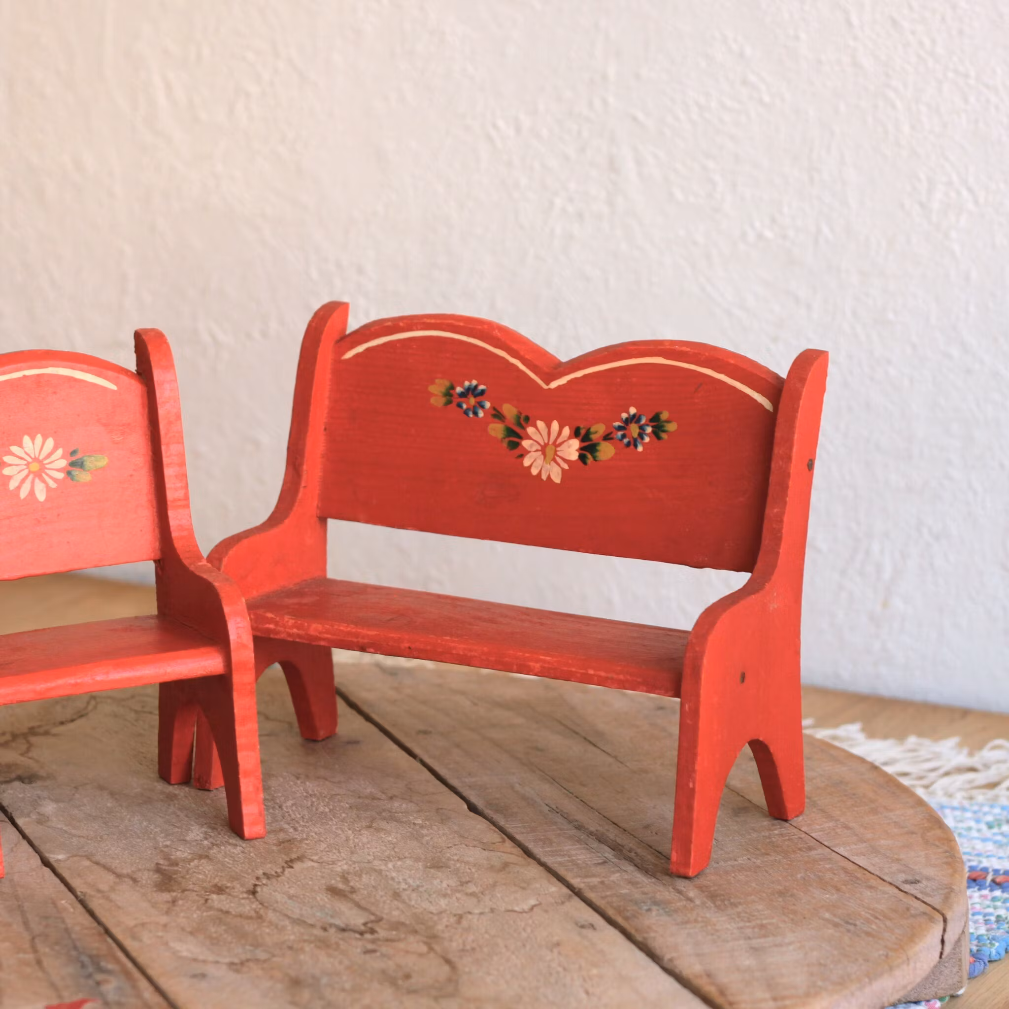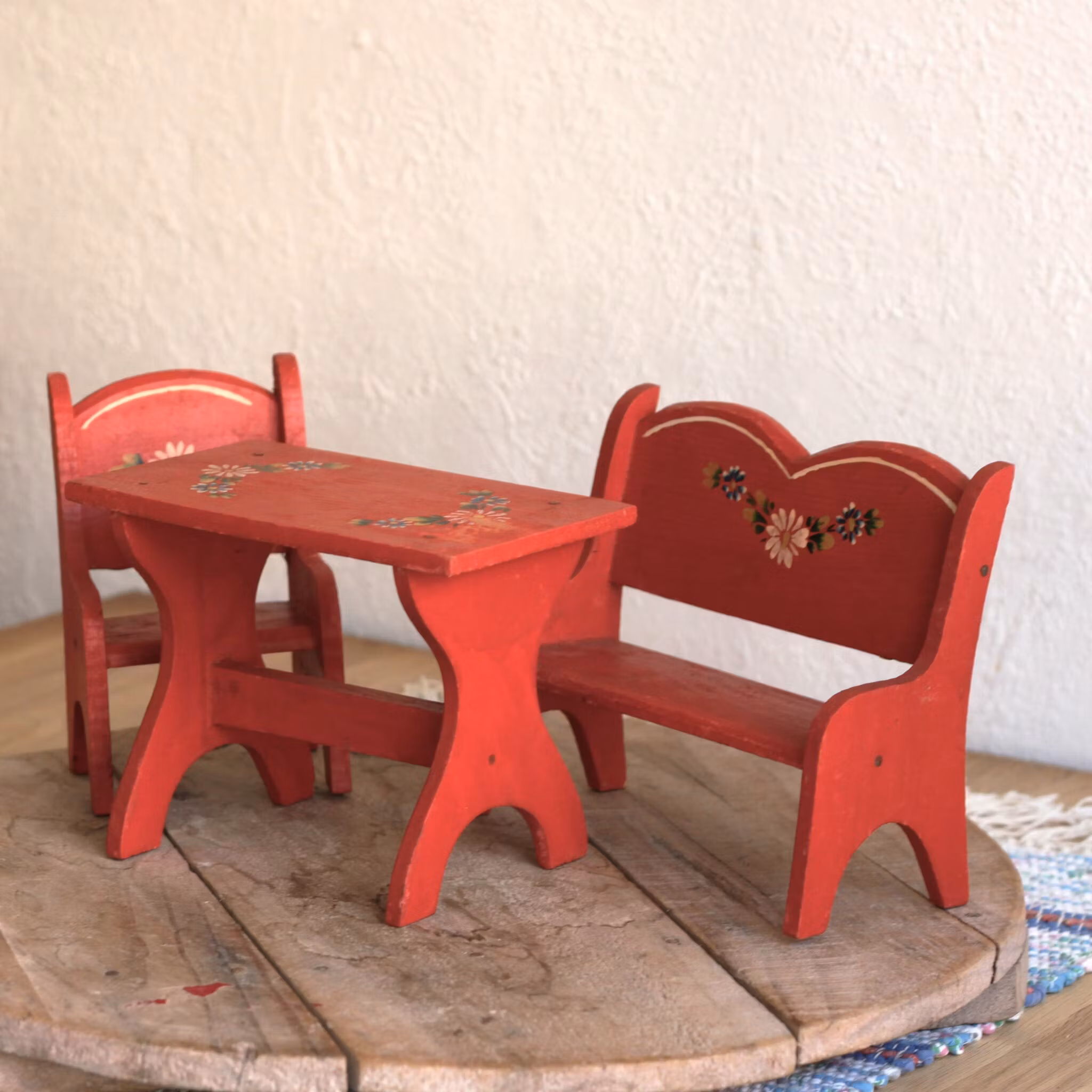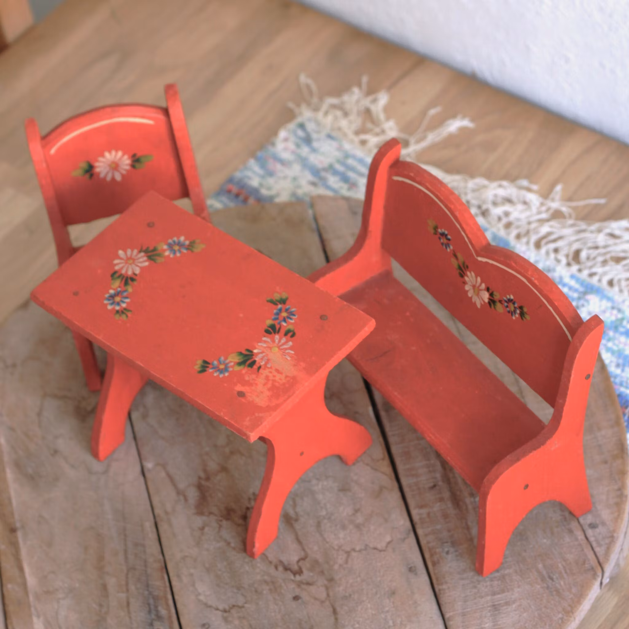bemålad grupp av möbler. Soffa, stol och ord i lagom storlek för dockor och nallar. Högsta höjden på soffa och stol är ungefär 15cm. Alla tre möblerna ingår i priset.