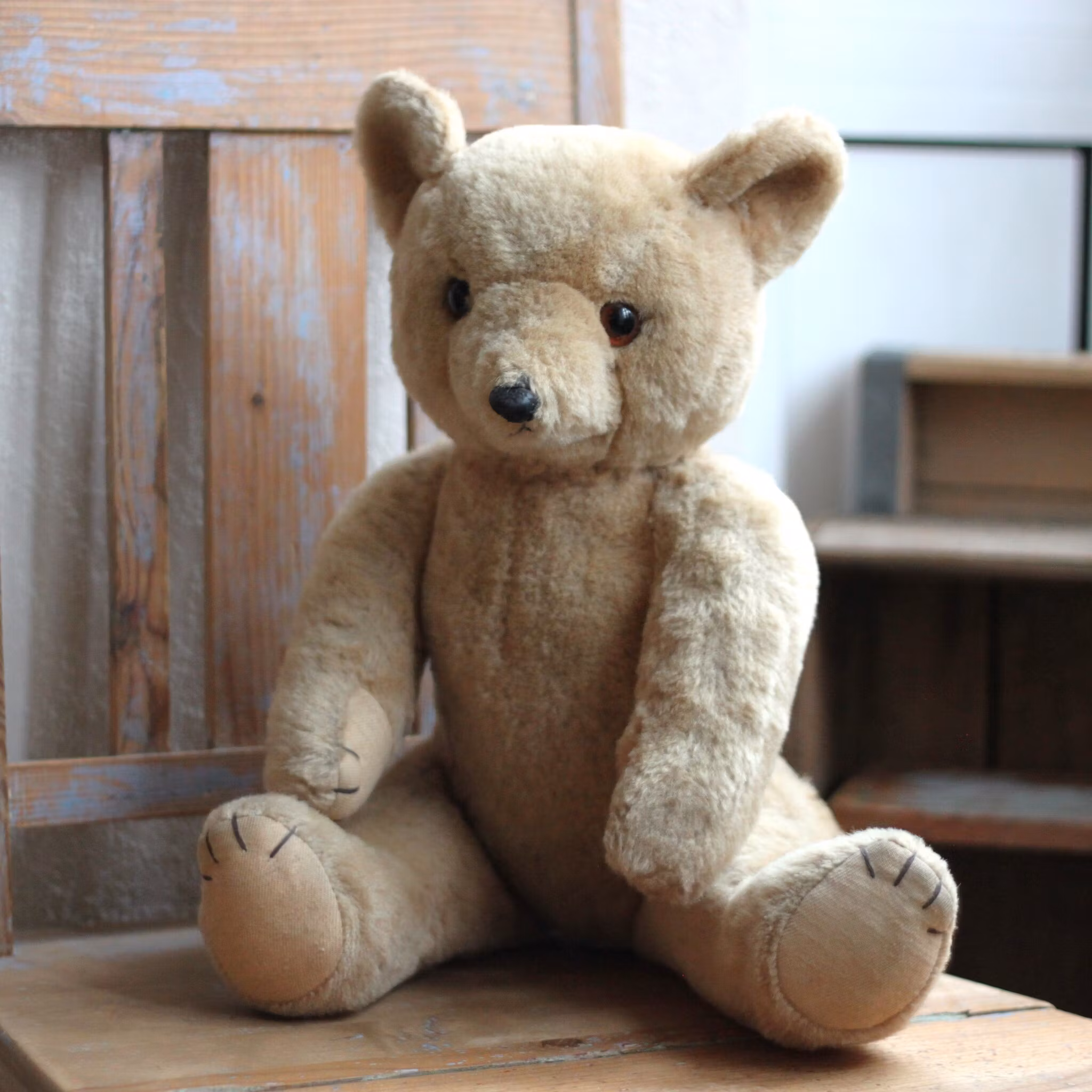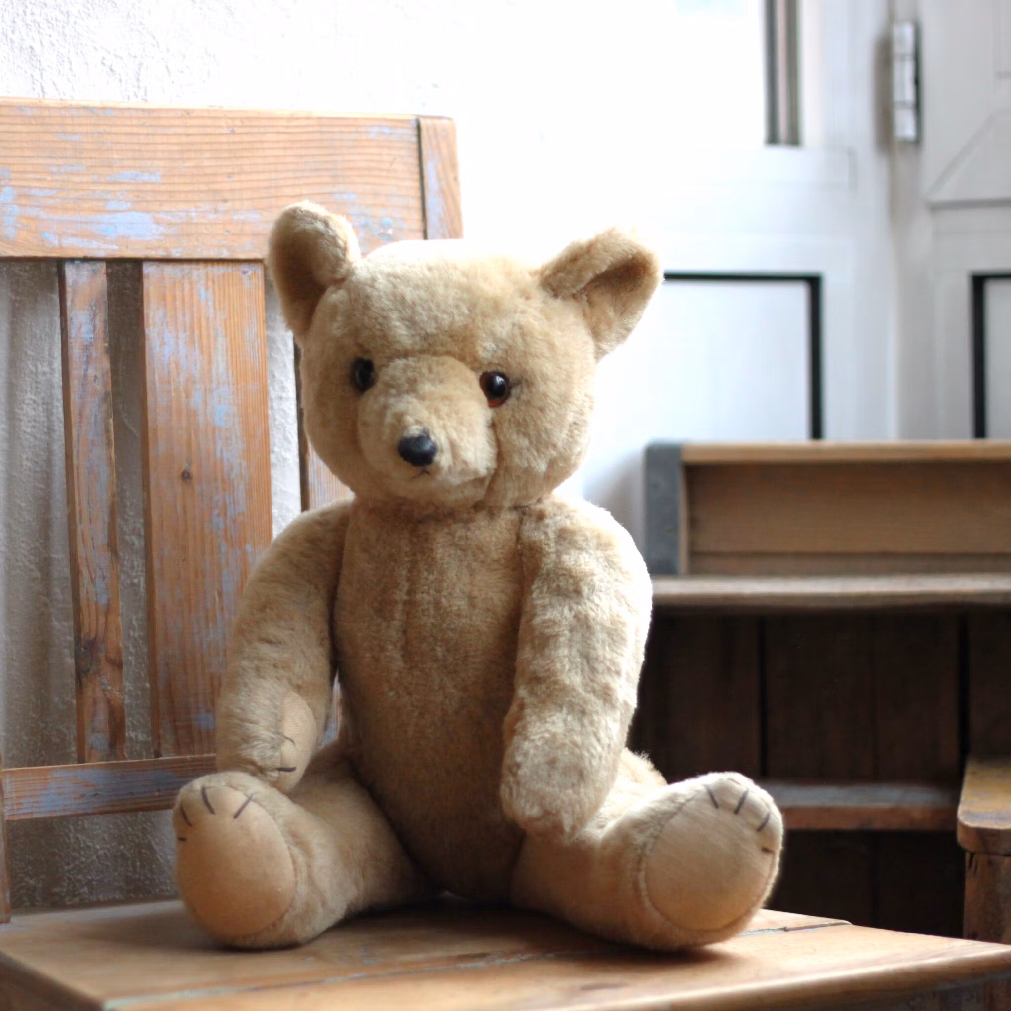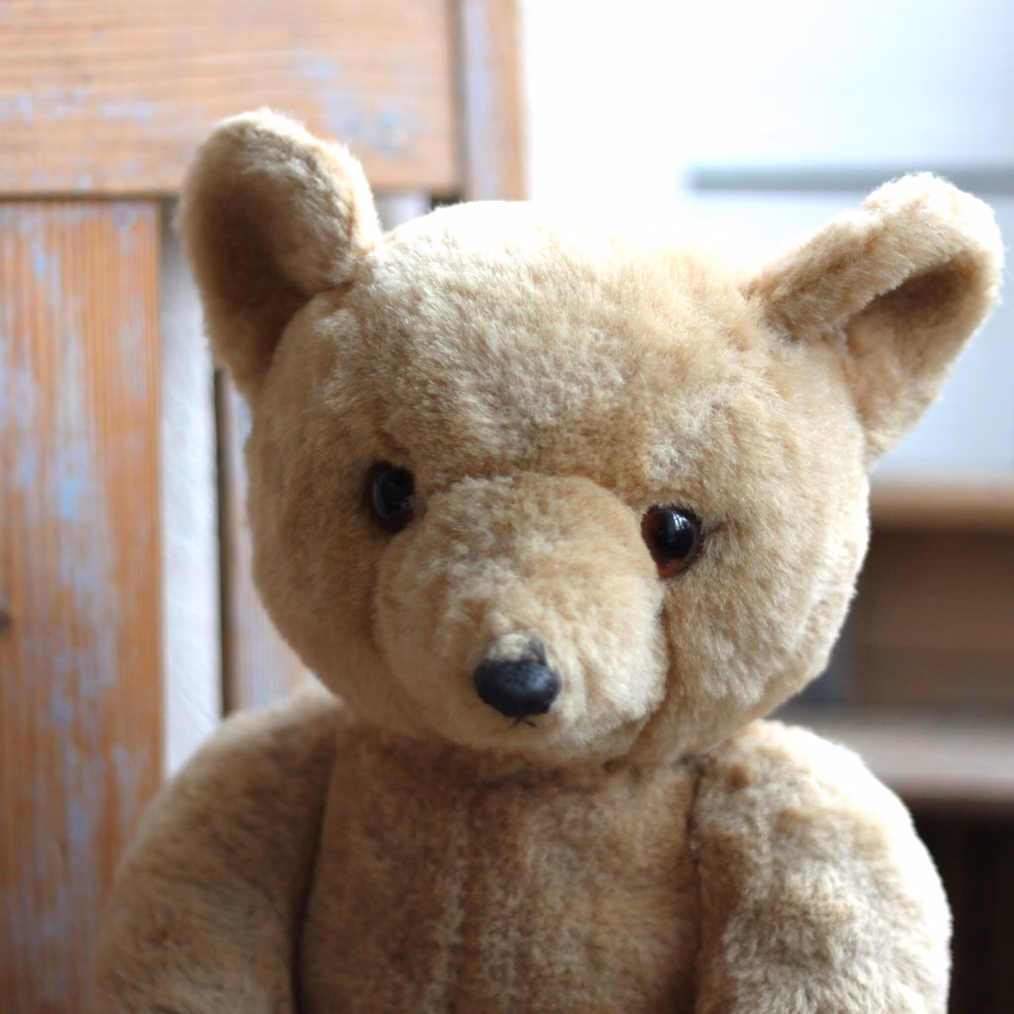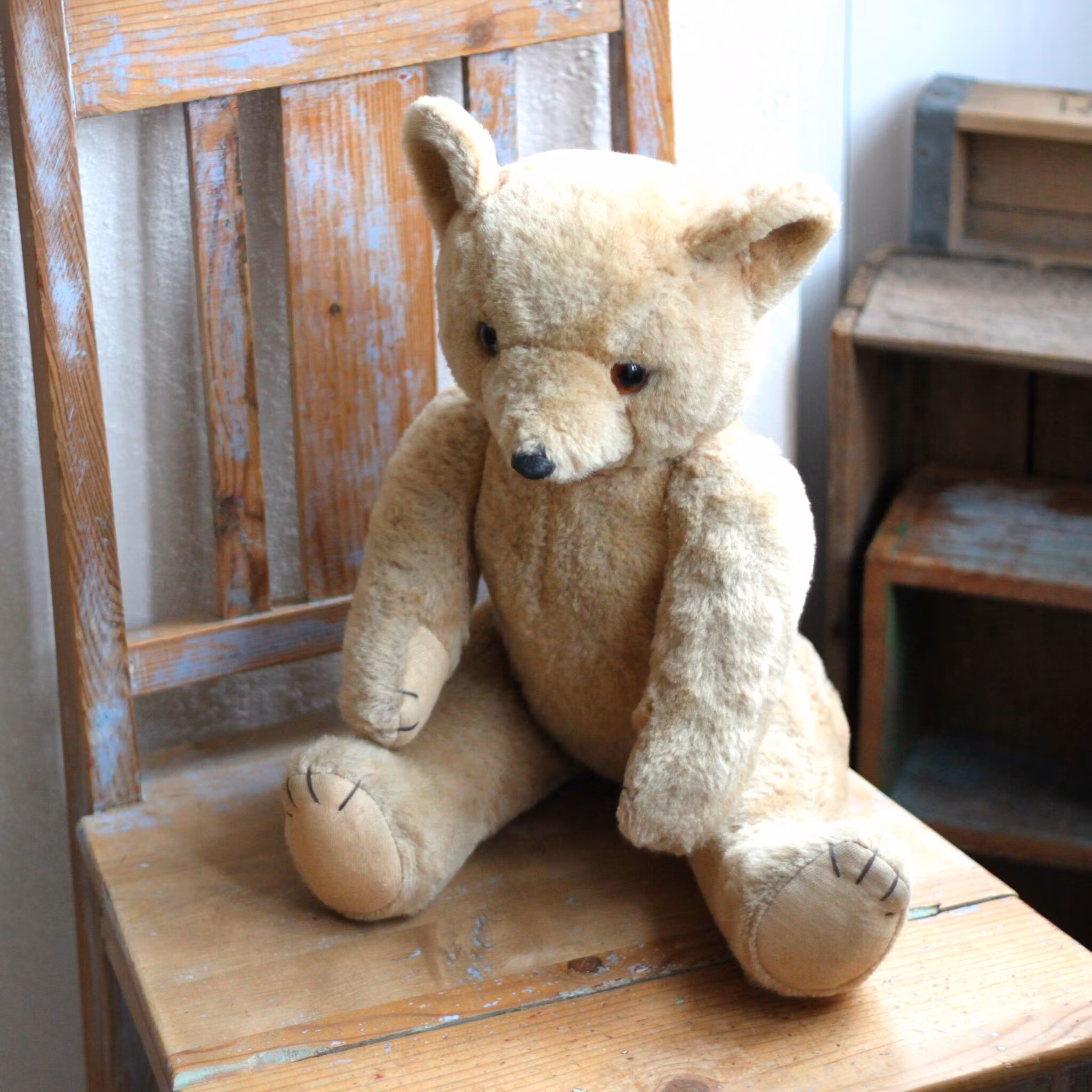 Stor fin trygg kompis som är bra på att kramas. Detta är en björn av det lite hårdare slaget, med armar och ben som kan vikas så att den kan sitta på en hylla eller stå upp. Björnen är mycket snäll, har små lagningar i ena höften samt bakom ett av öronen. Björnen är hela 48cm lång från hjässa till tå.