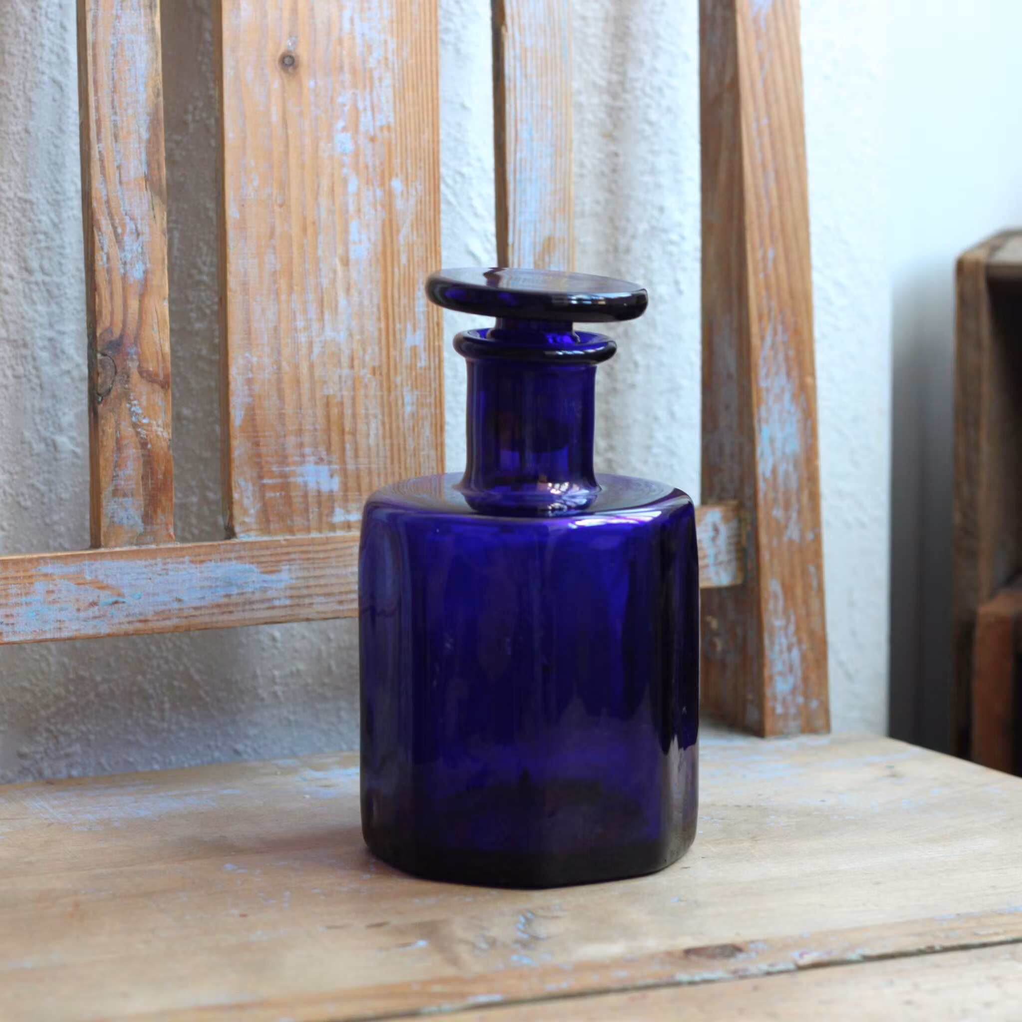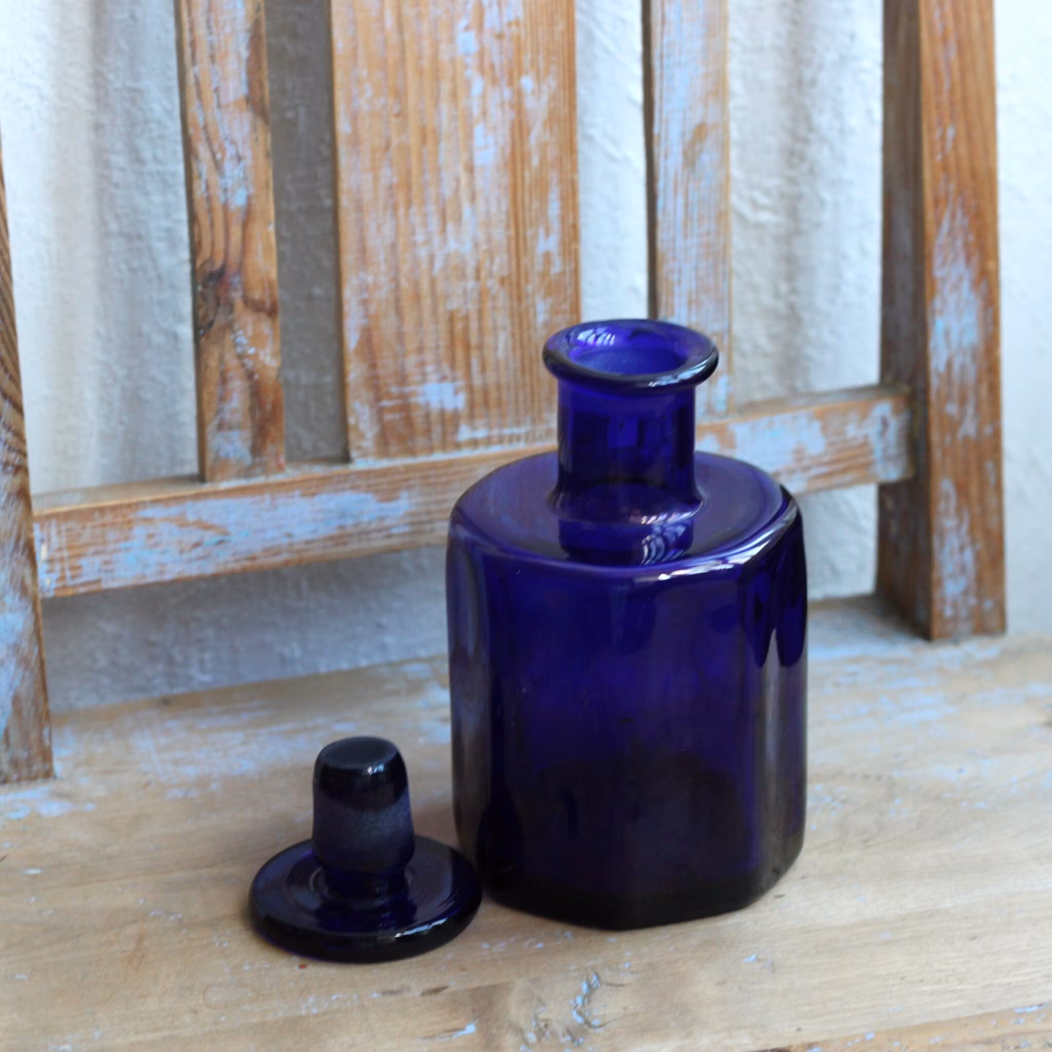 I lager. Antal: 1 Flaska - Apoteksflaska Blått Glas 299 kr Lägg i korgen Detta är ett äldre, unikt föremål som genom åren använts, älskats och fått "patina". Den här typen av föremål säljs i befintligt skick. Rejäl apoteksflaska i tjockt blått glas. Flaskan som är åttakantig , är med kork ungefär 14.7cm hög.