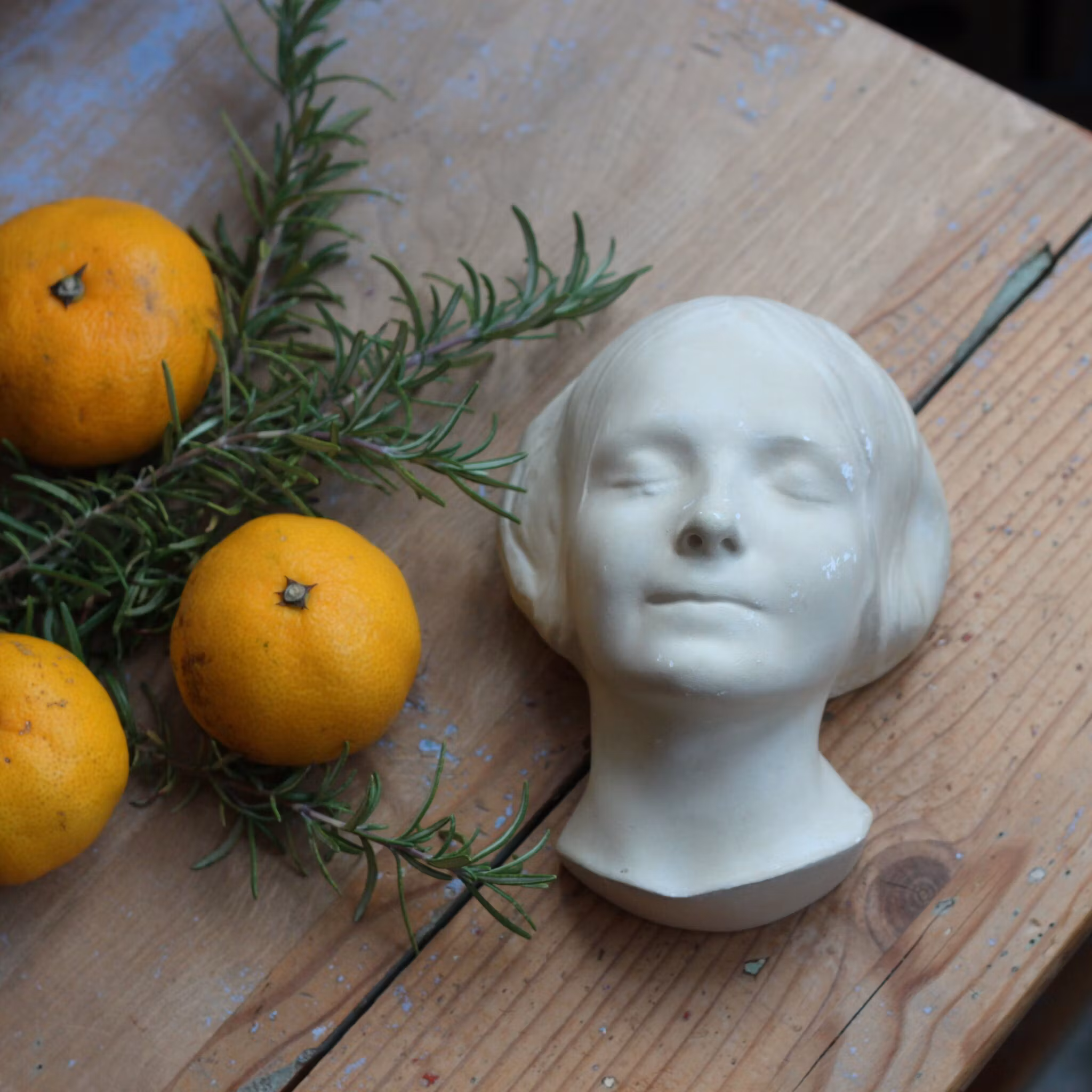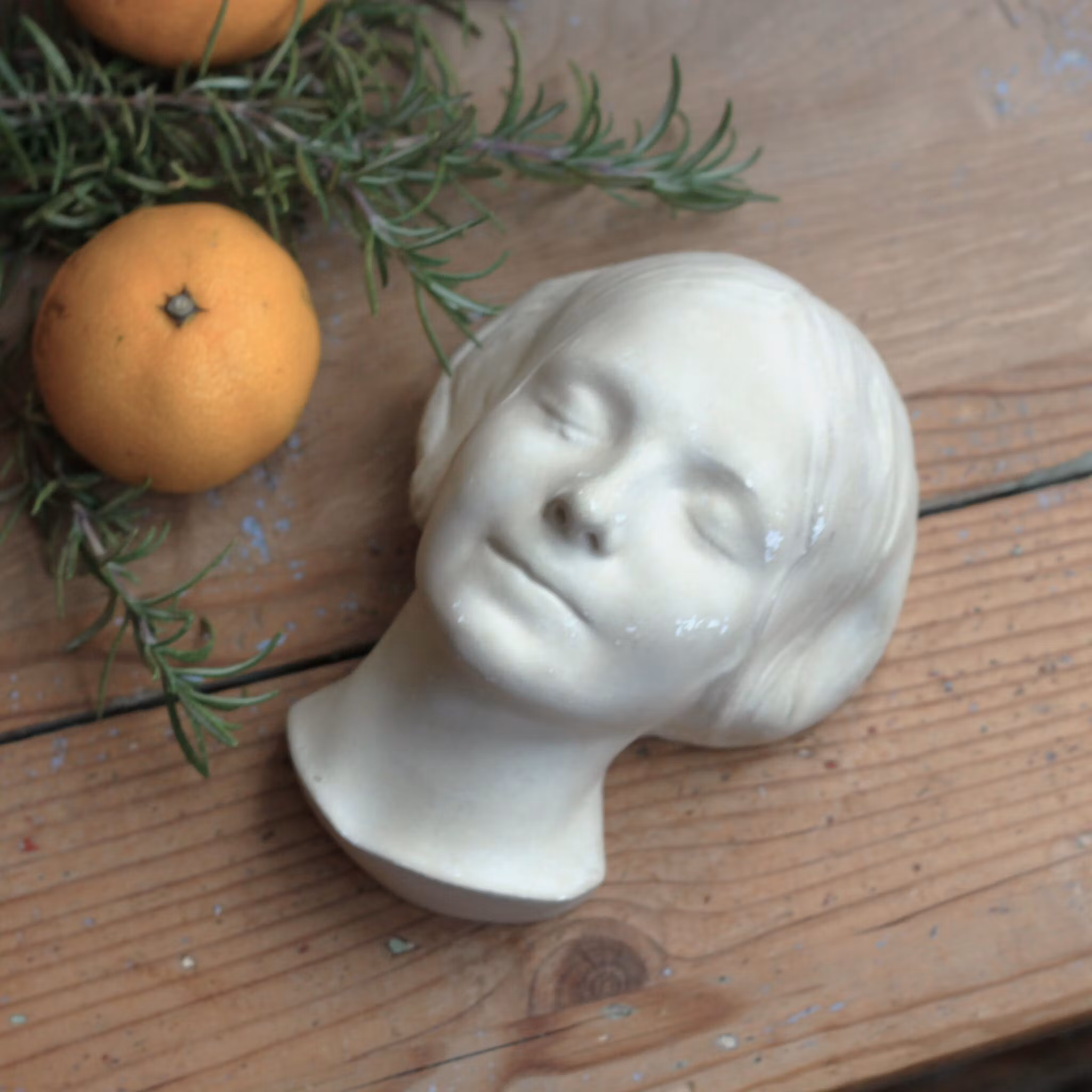 Skulptur, kvinnohuvud att hänga på väggen eller som på bilderna, att ha liggande. Denna ganska tunga pjäs är gjord av gips eller något liknande material. Figuren, som är ungefär 15 centimeter lång har en upphängning på baksidan.