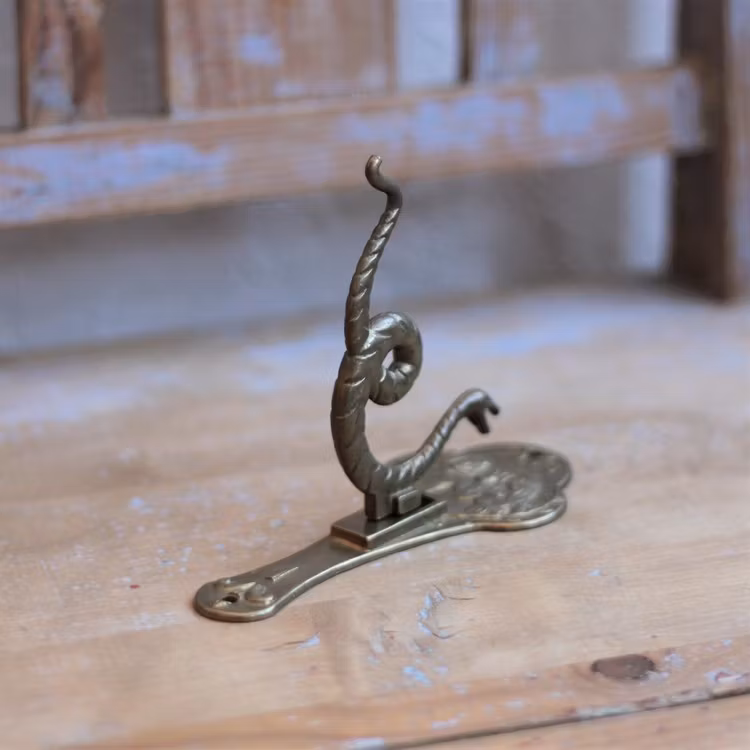 Krok att hänga på väggen. Kroken som är tillverkad i metall gör att enkelt plockas av sin hållare. Motivet är lite ovanligt med Adam, Eva och äppelträdet på själva bakstycket och kroken utgörs av ormen.