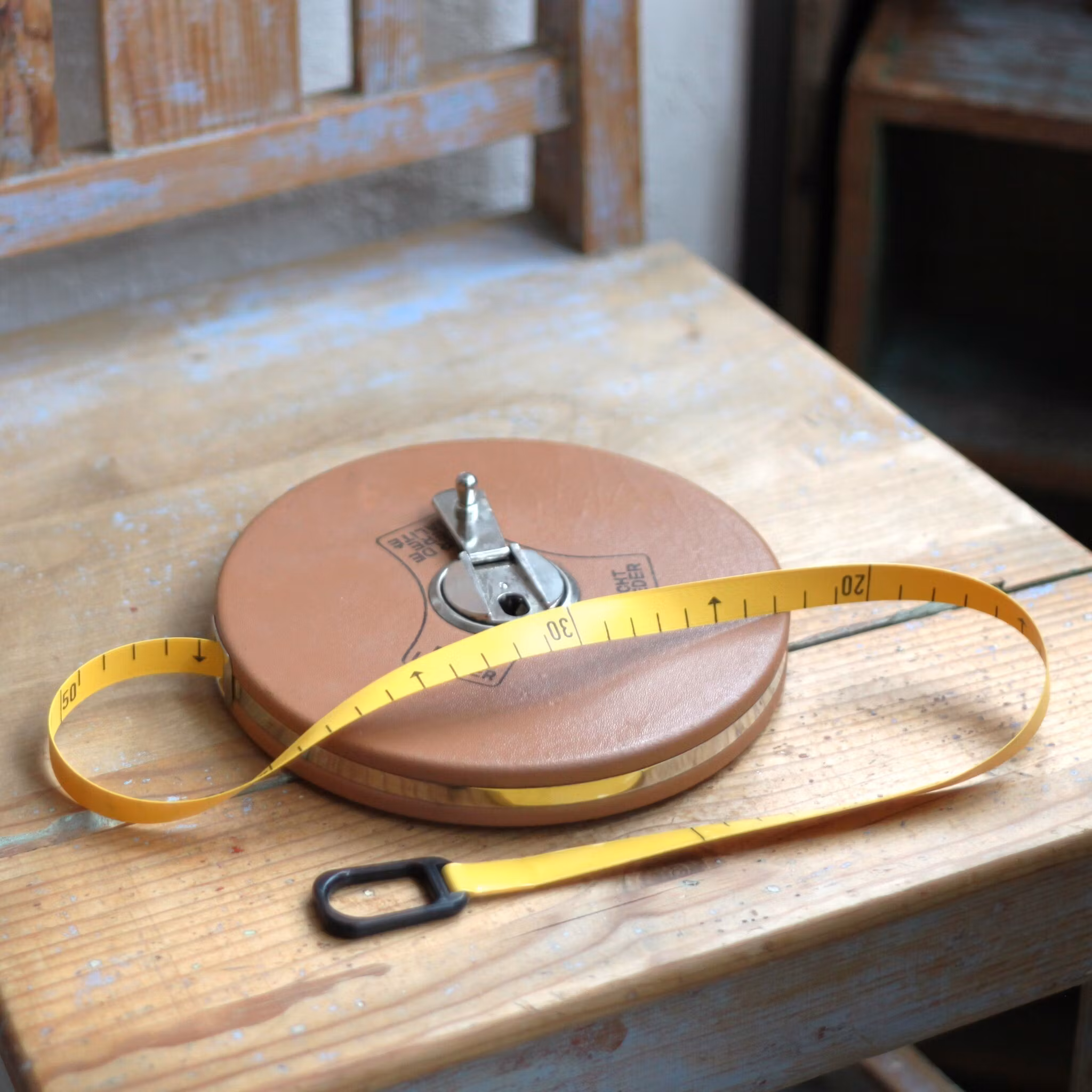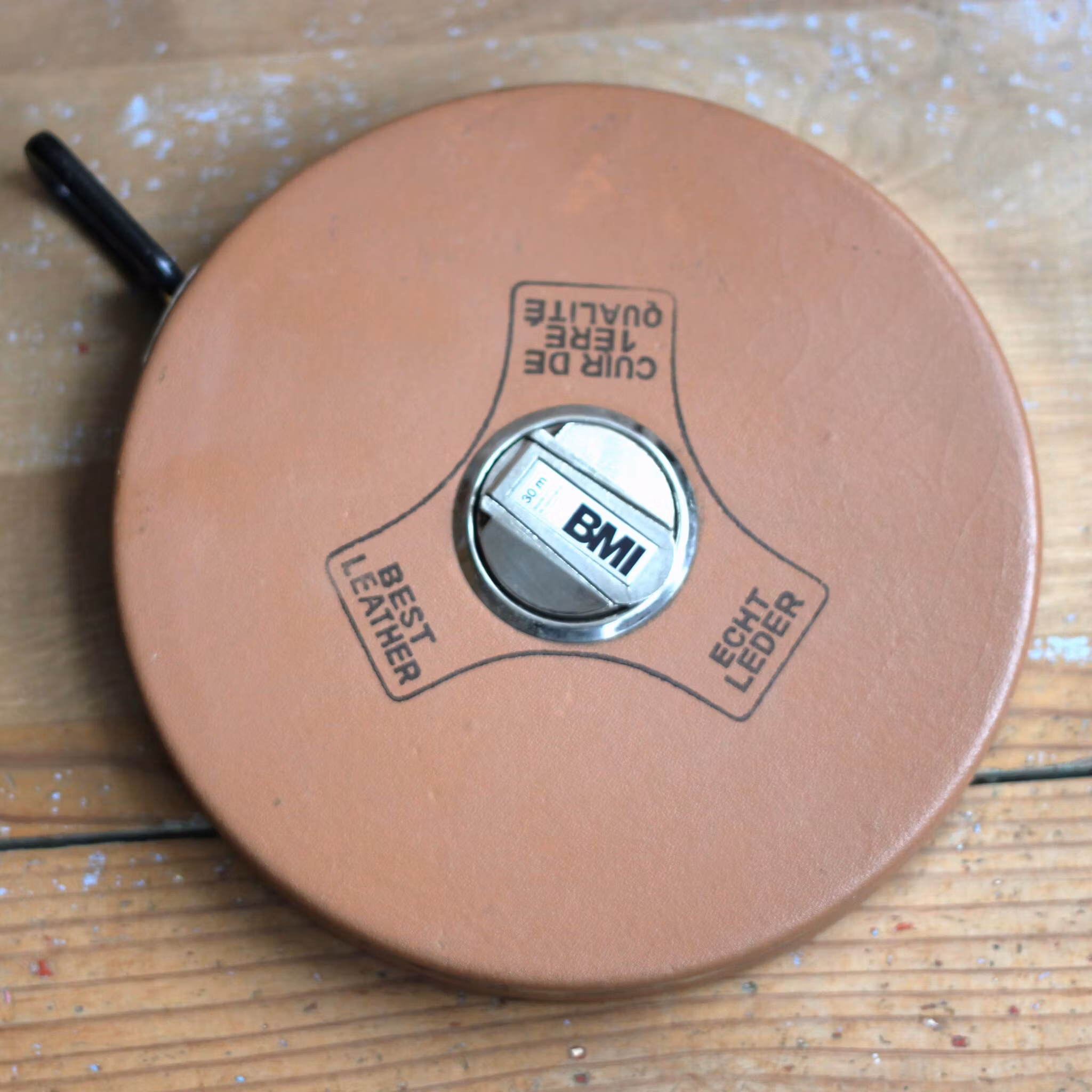 Många av oss minns den här typen av måttband från skolans gymnastiklektioner. Mycket praktiskt att ha i hemmet och mäta både ute och inne. Fodralet är läderklätt och har en vev att dra in måttbandet med.