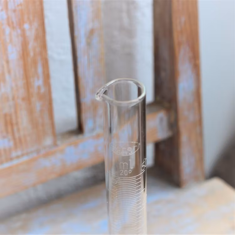 Ett smalt mätglas som detta kan få vara en vacker vas eller ett ljusfång i ett fönster, kanske förvaring för stickorna som alltid tycks gömma sig mellan projekt eller som här, få husera en vacker fjäder. Mätglaset är ca 20cm högt och har en liten hällpip. Text och mängdmarkeringar är i en ljust grå, nästan vit nyans.
