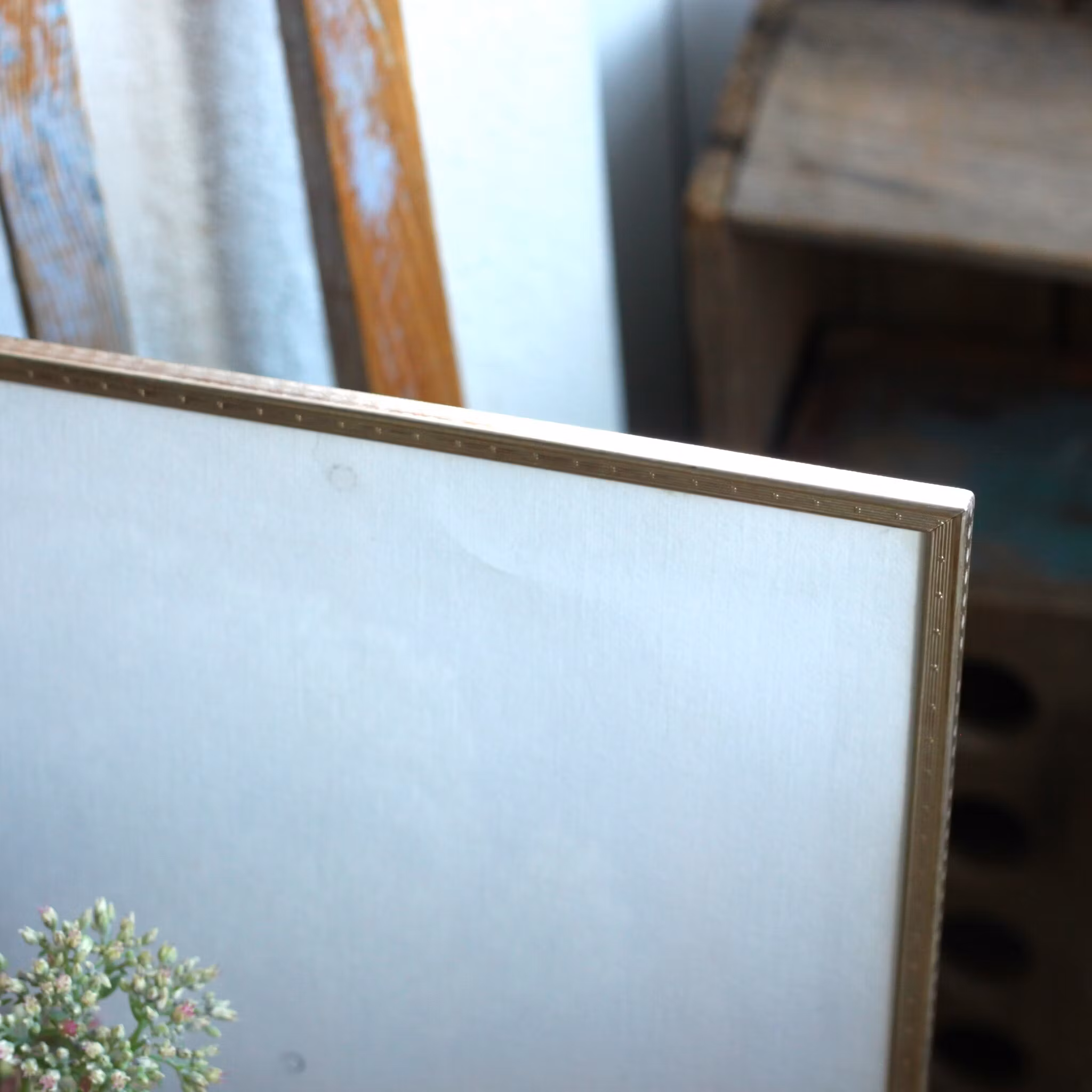 Snygg ram i metall. Ramen som är i en lite lust guldig metall har ett lite slätt glas och både stödben och upphängningsögla bak. Stödbenet kan vinklas så att ramen kan ha både stående och liggande format. Ramen är stor, ca. 30cm x 24.4cm i ytterkant.