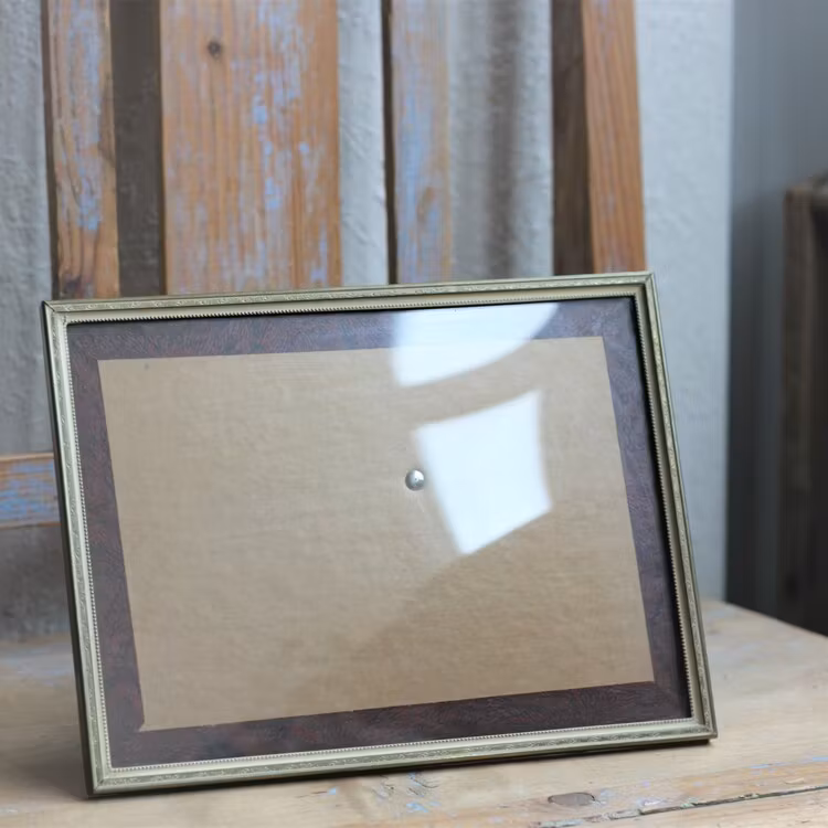 Ram i ljus guldig, delvis vitmålad metall. med fina detaljer och ett lite buktat glas. Ramen har stödben och är lika snygg tom som med ett fint motiv.