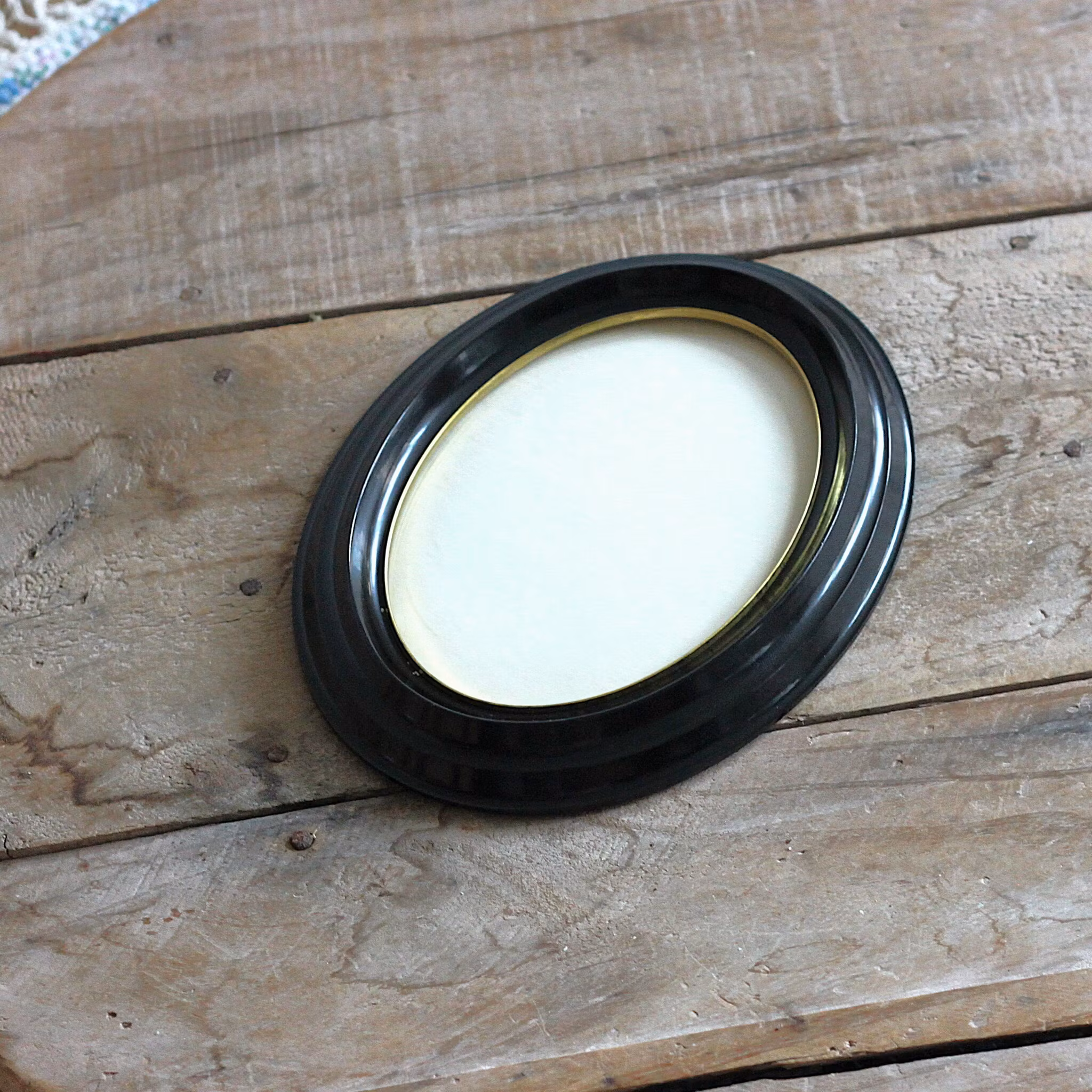 Oval ram i svart bakelit med smal guldkant i metall. Ramen har upphängning baktill och är på längsta stället ca.18.5cm lång.