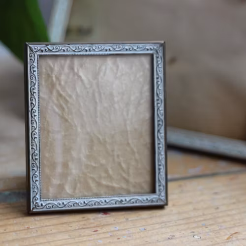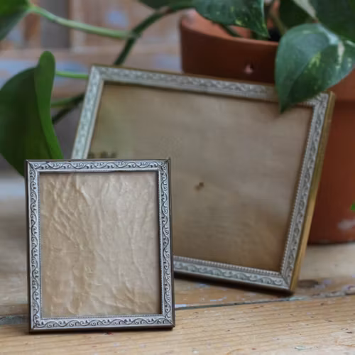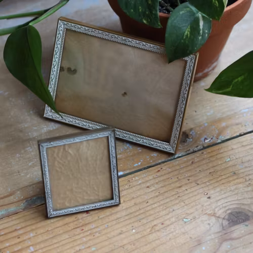 Liten dekorativ ram i metall med glas framför den bild du själv väljer att sätta i, om du nu vill ha ett motiv i den... Mått på denna ram är ca 7.2 x 6.2cm och den är avsedd att ha stående.