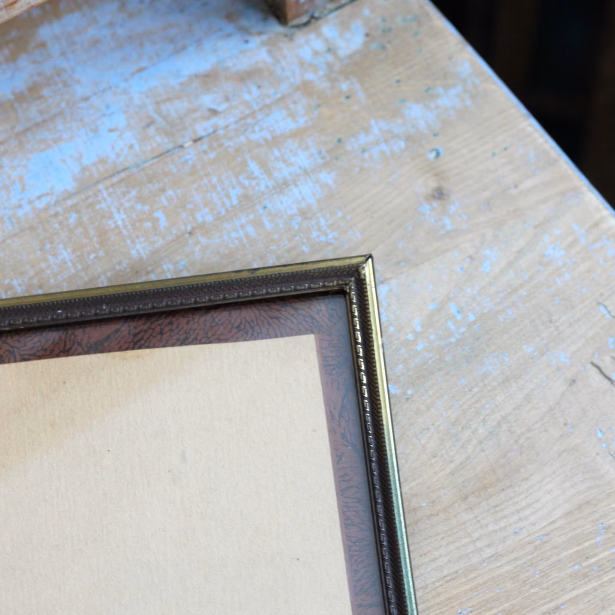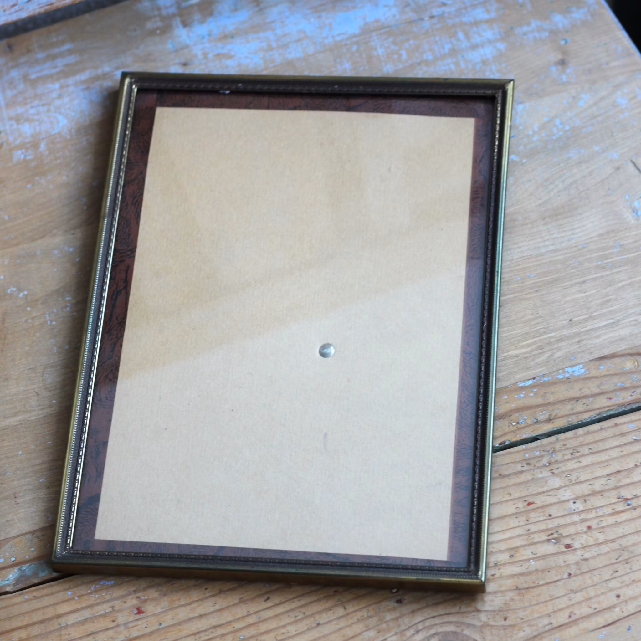 Fin ram i en antikguldig metall med en mörkare, dekorativ rand. Ramen har ett platt glas och stödben. Stödbenet kan vinklas så ramen får antingen stående eller liggande format. Ramen är ca. 23cm x 17cm i ytterkant.