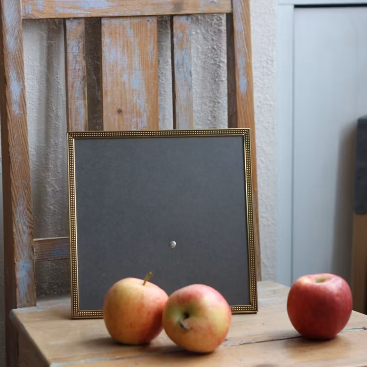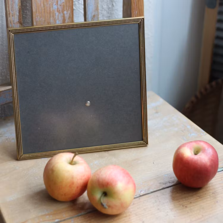 Superfin kvadratisk ram i antikbehandlad metall, fina detaljer längst kanten och ett slätt glas. Ramen har stödben, ingen upphängningsögla och är lika snygg tom som med ett fint motiv.