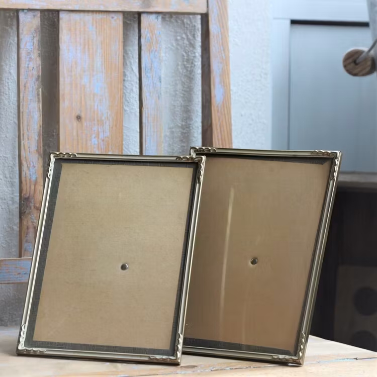 Ram i ljus guldig, delvis vitmålad metall. med fina detaljer och ett lite buktat glas. Ramen har stödben och är lika snygg tom som med ett fint motiv.