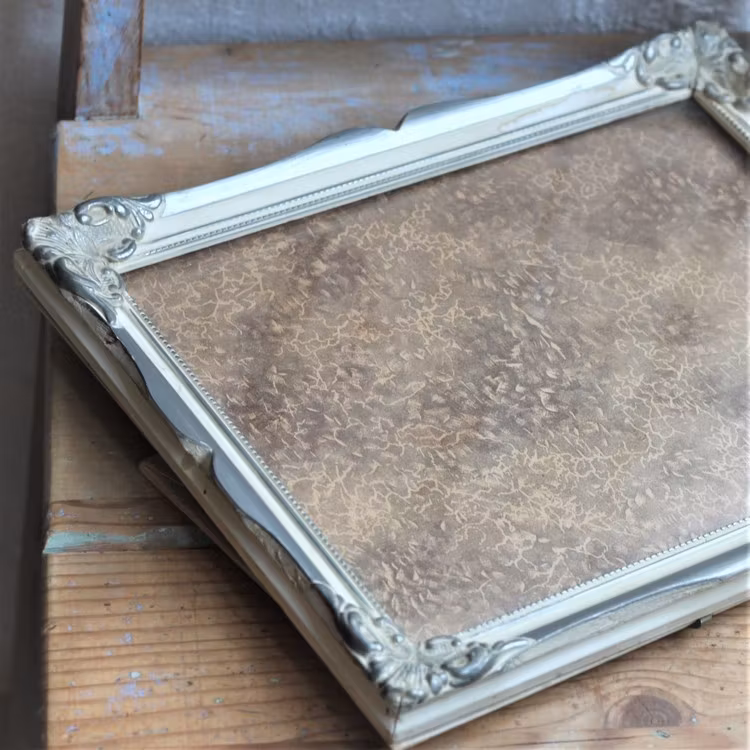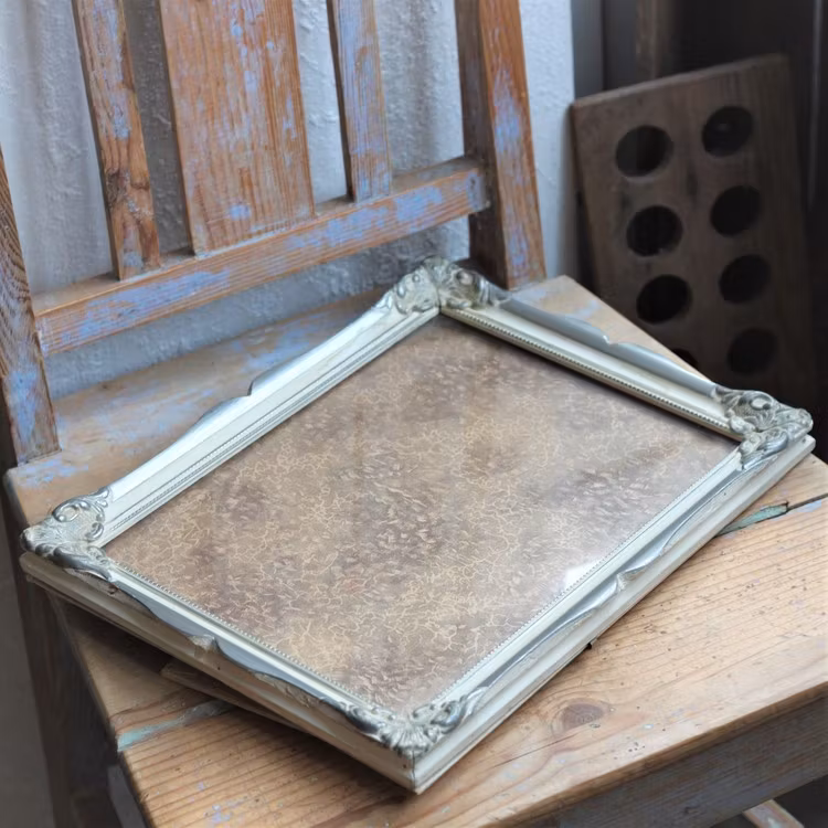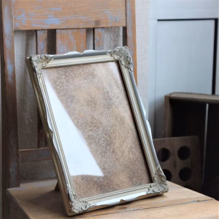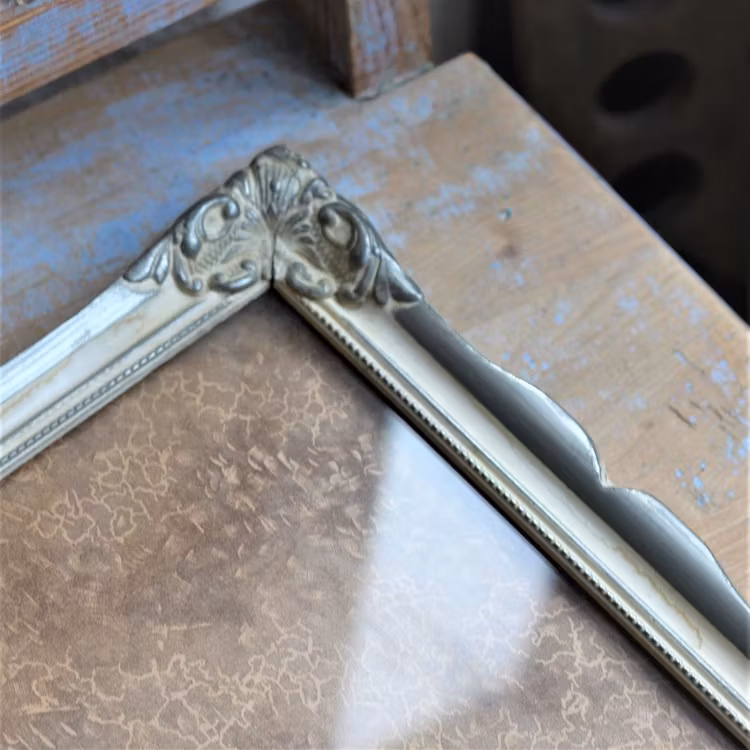 Krussedullig, ganska stor ram på ca 31 x 24cm. Ramen är tillverkad i träl och målad i gulvit och guldfärg. Ramen är gjord för att stå och har en stödklaff baktill. Den står lika bra hög som bred. Om man vill ha den på väggen får man sätta fast någon form av hänganordning på baksidan.