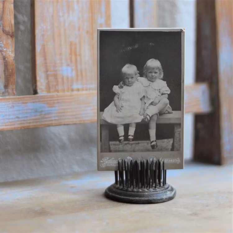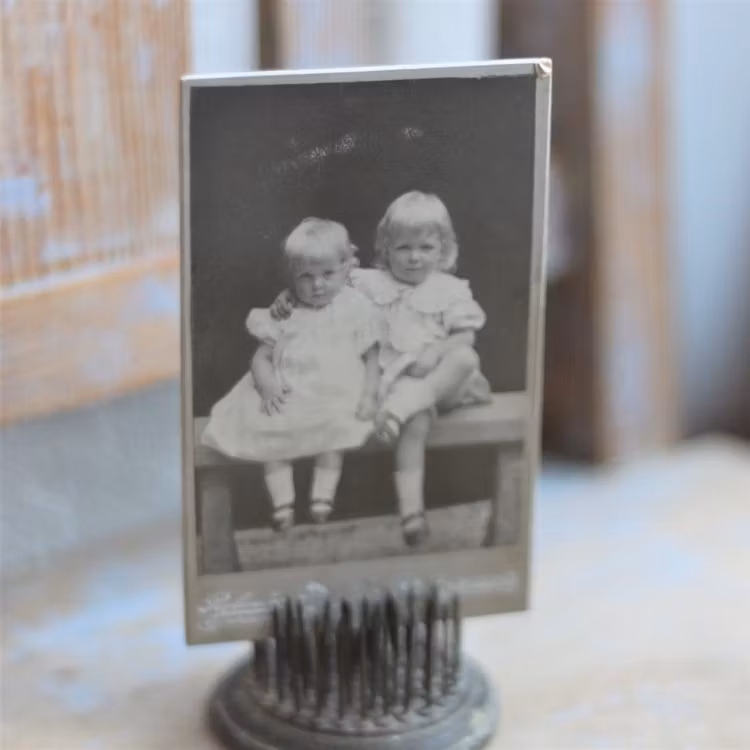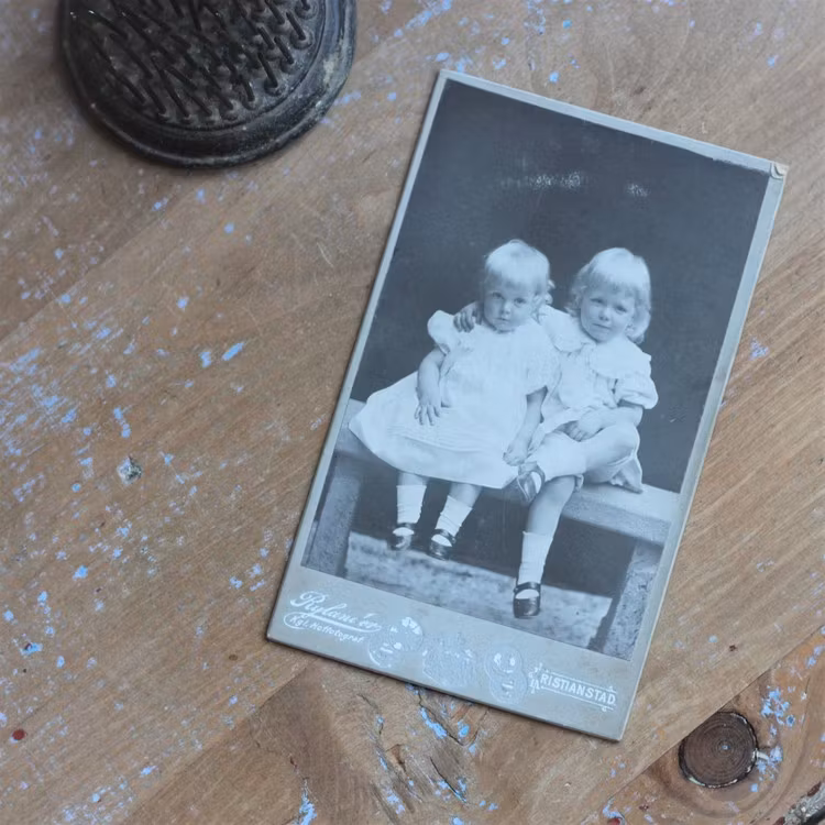 Familjefotografi av den där fina gamla sorten ett sk. "kabinettfotografi" där fotografiet är monterad på en kartongskiva och fotoateljéns namn står präglat på kartongen. Syskonen på bilden är två små pojkar för visst kunde pojkar ha vit ryschig klänning på den tiden. Vi har eller har haft fler fotografier inne, som föreställer samma fina syskonpar. Mått på kartongskivan är ca 6.5 x 10.5cm.