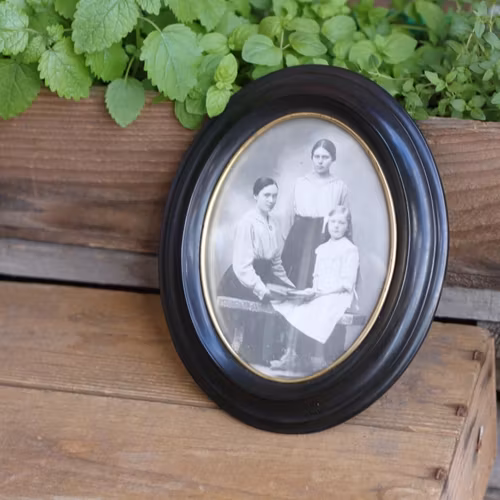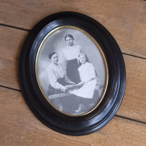 Vi tror att flickorna i bild är systrar, de ser så lika ut, i alla fall de två äldsta. Ram i svart bakelit. Upphängningsögla på baksidan. Ramen är ca 19.6cm lång.