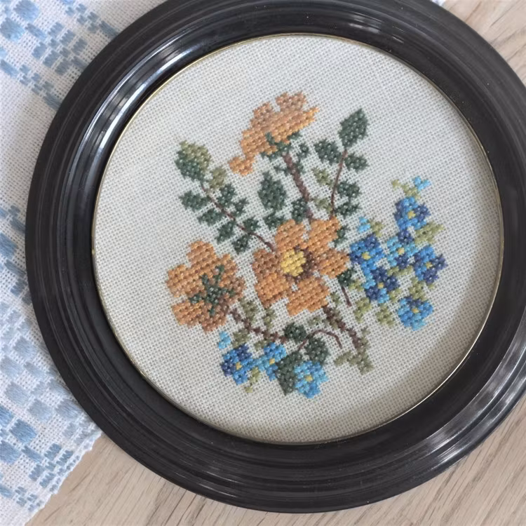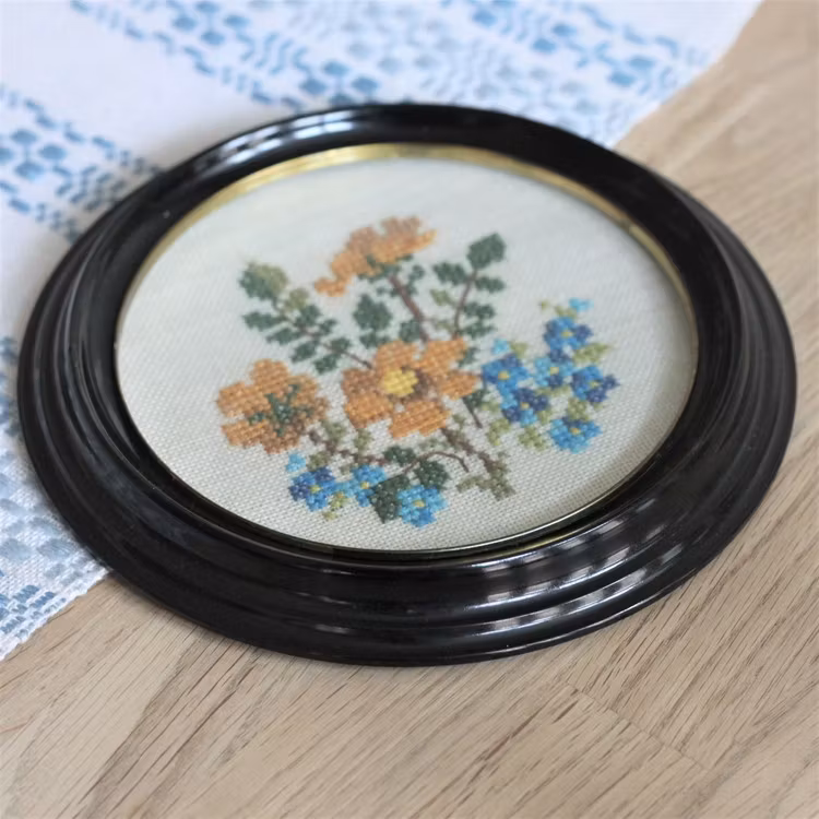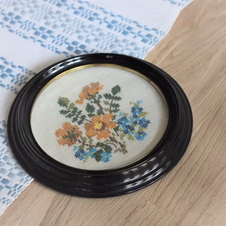 Oval ram i svart bakelit med smal guldkant i metall. Ramen har upphängning baktill och är ca 16.3cm rakt över. Broderiet med blommor väljer en själv om det ska få vara kvar eller bytas ut mot något annat.