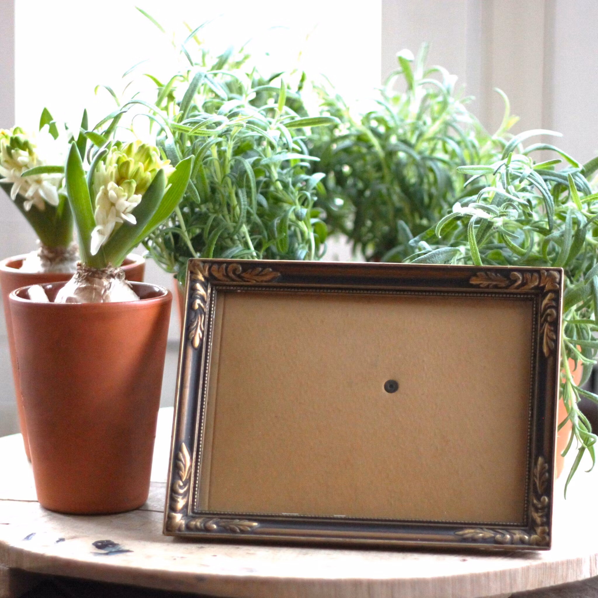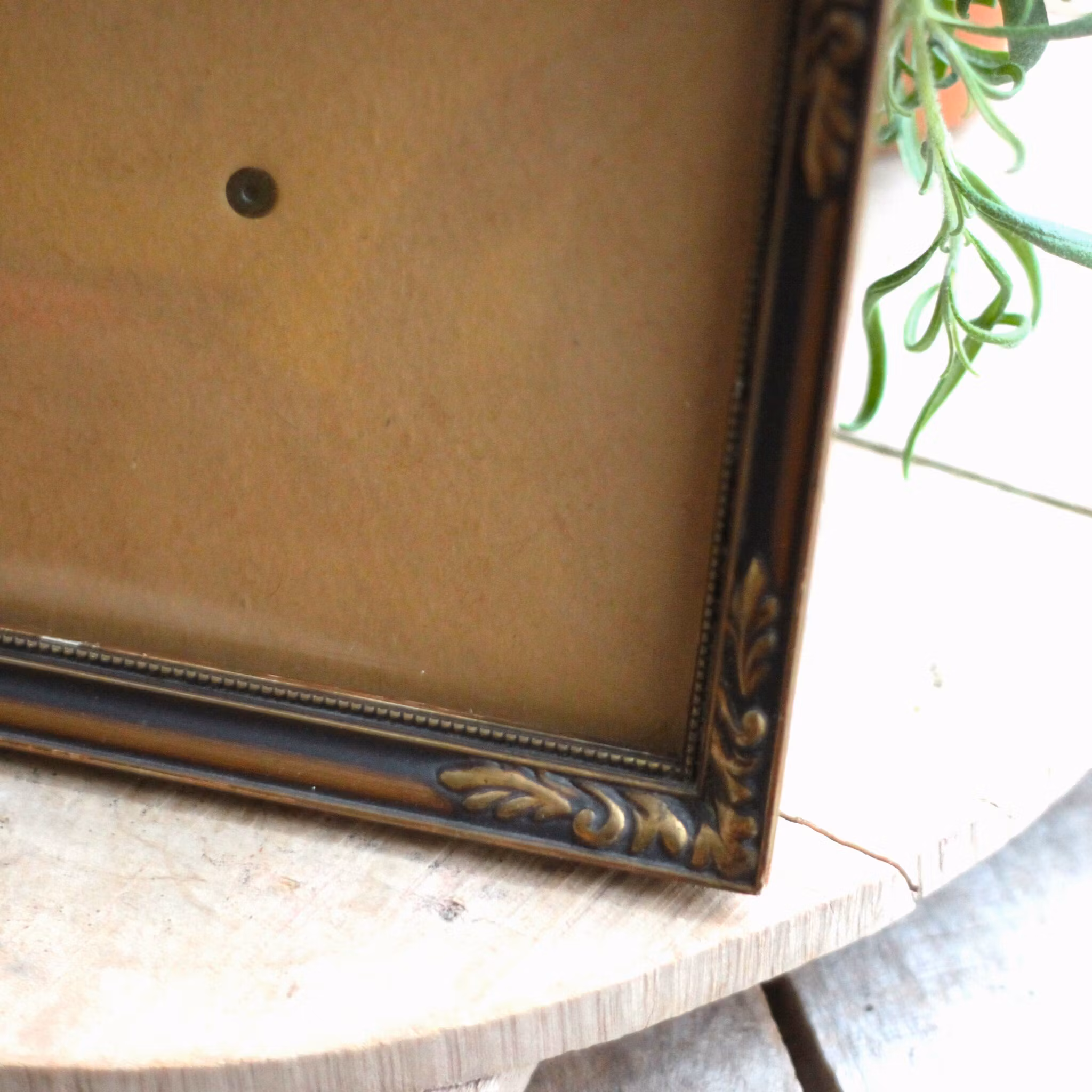 Ram, kopparfärgad med dekor i alla fyra hörn. Ramen är ca. 20.4cm x 15.4cm, den här ett buktat glas, stödben samt upphängning för att stå på höjden.