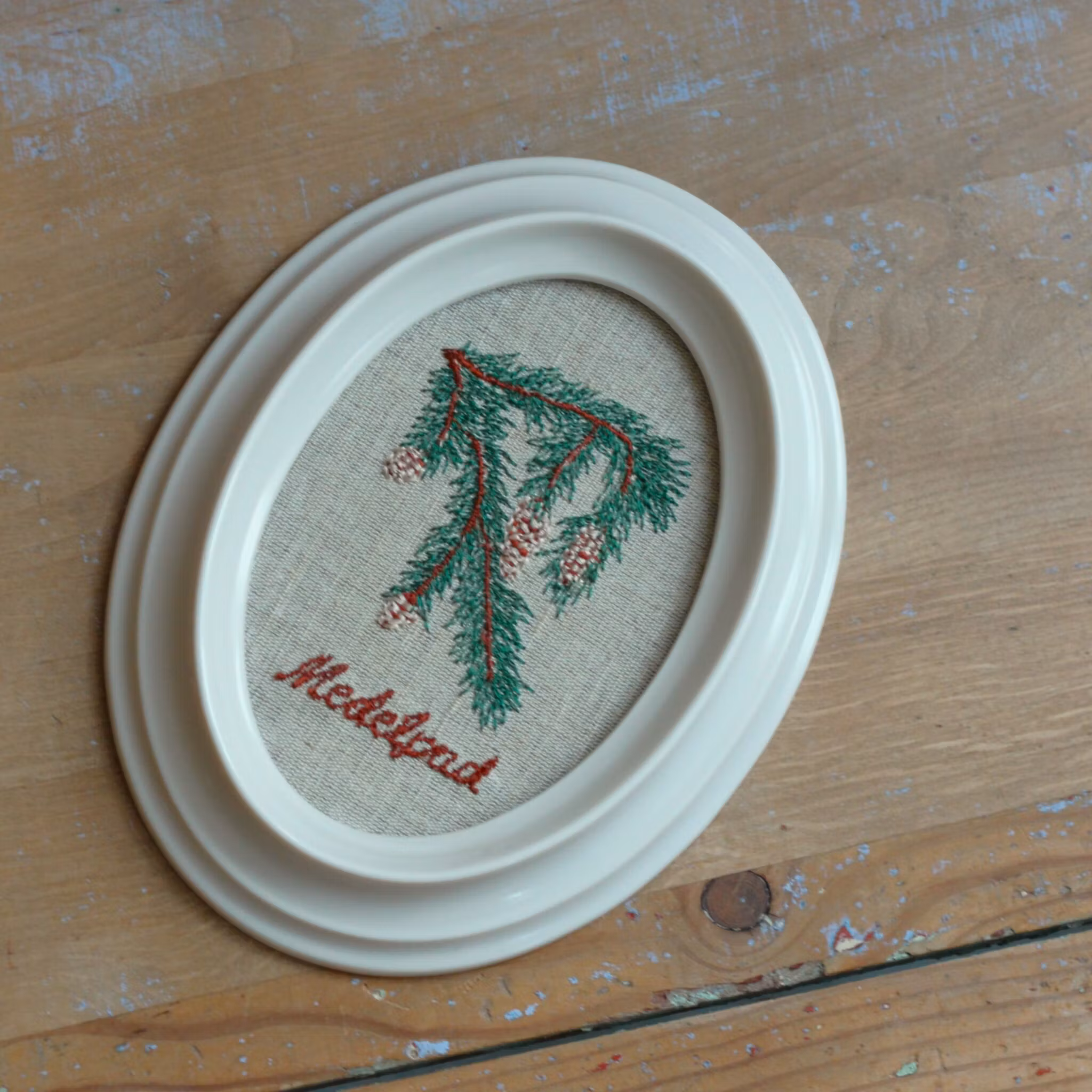 Oval ram i vit bakelit med ett fint broderat motiv av Medelpads landskapssymbol Gran. Ramen har upphängning baktill och är på längsta stället ca.18cm lång. Denna ram har inget glas.