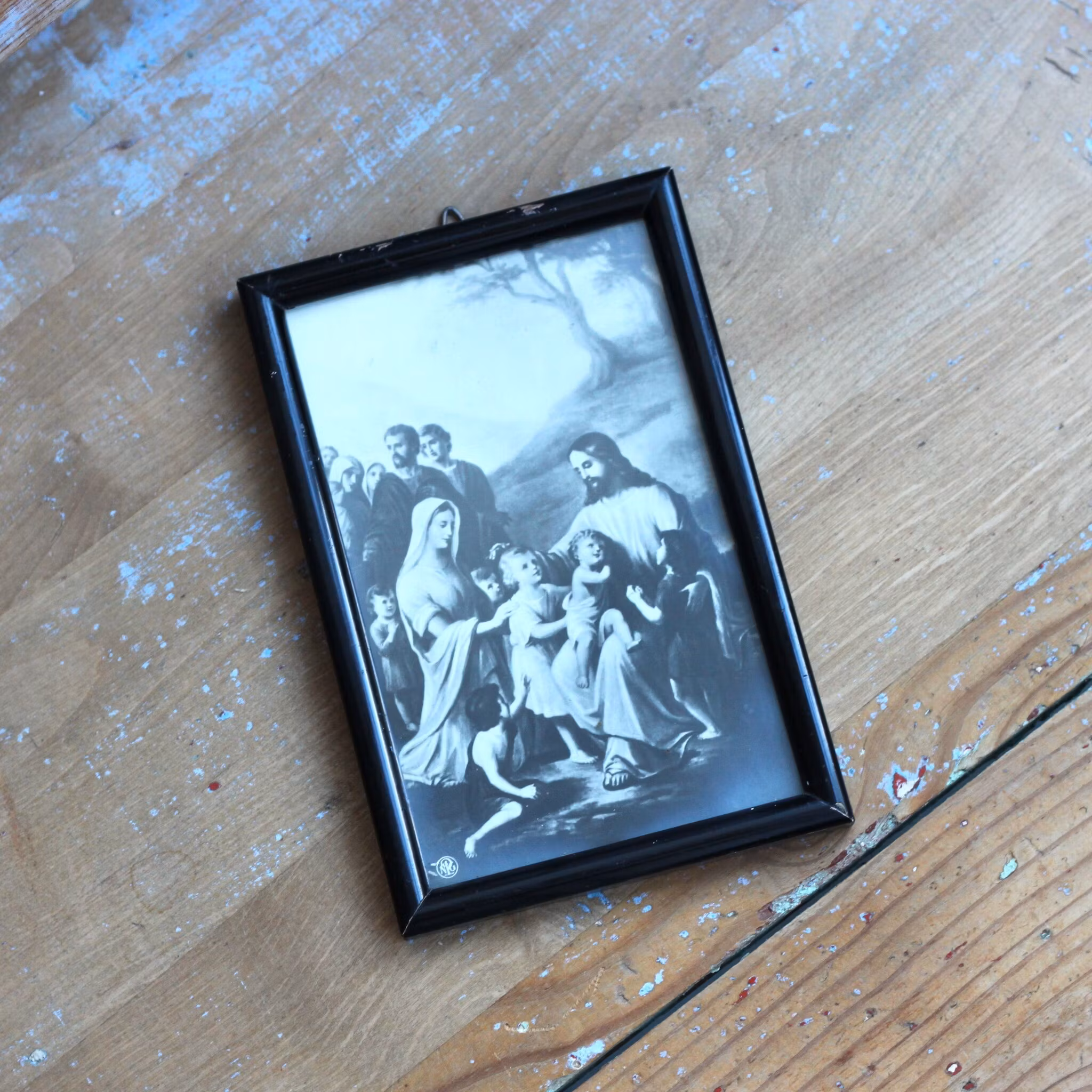 Fin liten tavla med bibliskt motiv. Ramen är i svartmålat trä, glaset är platt och det finns en upphängningsögla baktill. Ramen är 14.5cm x 9.6cm i yttermått.
