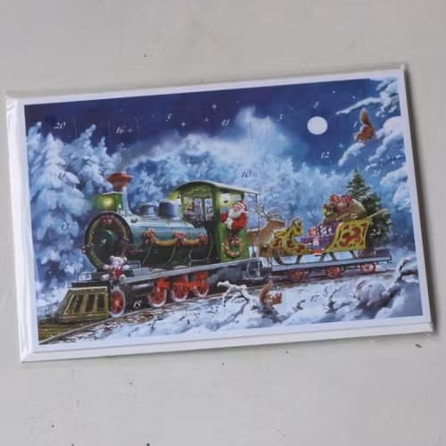 I lager. Antal: 3 Adventskalender - Tomten kör tåg, Kort med Kuvert 39 kr Lägg i korgen Adventskalender med vintagekänsla och glitter. Vackert äldre motiv i nytryck. Kalendern är11,5x17 cm.Kalendern är ett dubbelkort och kuvert ingår, om du vill skicka den till någon ingår.Denna produkt ingår i "småfrakt".