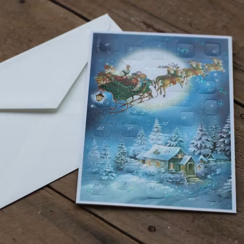 I lager. Antal: 1 Adventskalender - Tomtens Släde Flyger, Kort med Kuvert 39 kr Lägg i korgen Adventskalender med vintagekänsla och glitter. Vackert äldre motiv i nytryck. Kalendern är11,5x17 cm.Kalendern är ett dubbelkort och kuvert ingår, om du vill skicka den till någon ingår.Denna produkt ingår i "småfrakt".