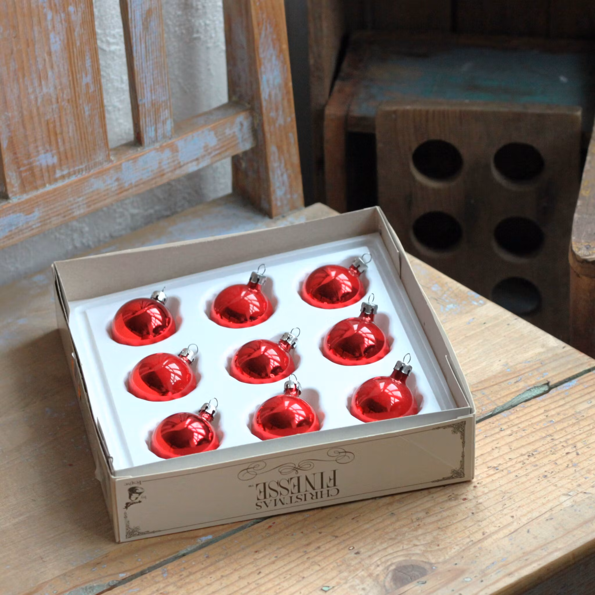 Ljuvliga små Julgranskulor i Glas. Det är nio fina mörkt röda kulor i lådan. Kartongen är 19.2x19.2x3.5cm. Alla kulorna i asken är lika stora.