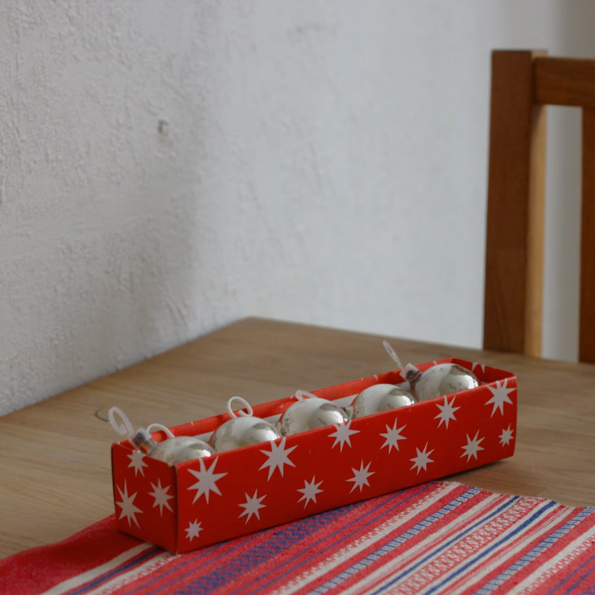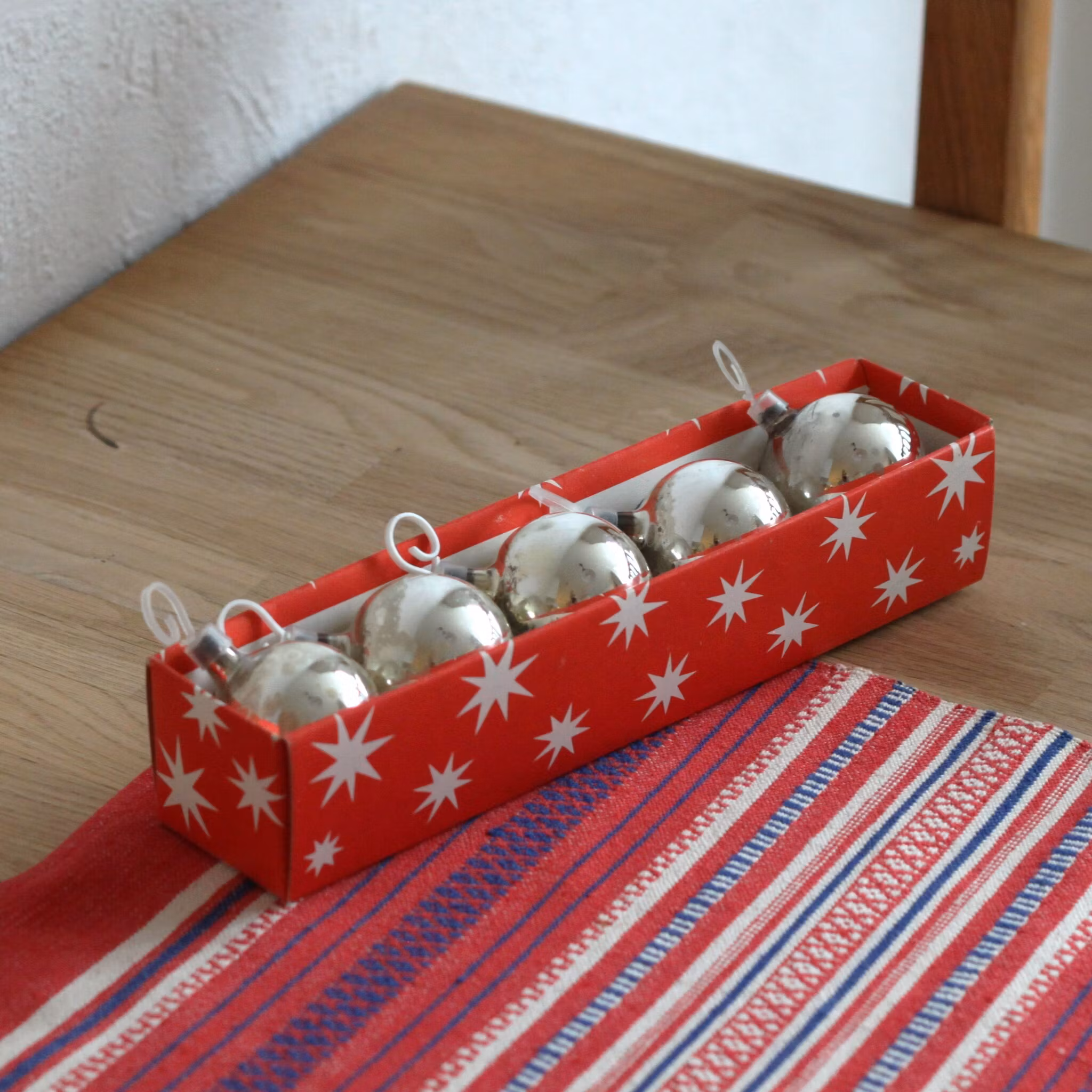 5 vackra silvriga äldre Julgranskulor i glas. Det är fem stycken i en kartong och det kan finnas flera kartonger inne. Kartongen kulorna ligger i är 23x.4.5x4.5cm.