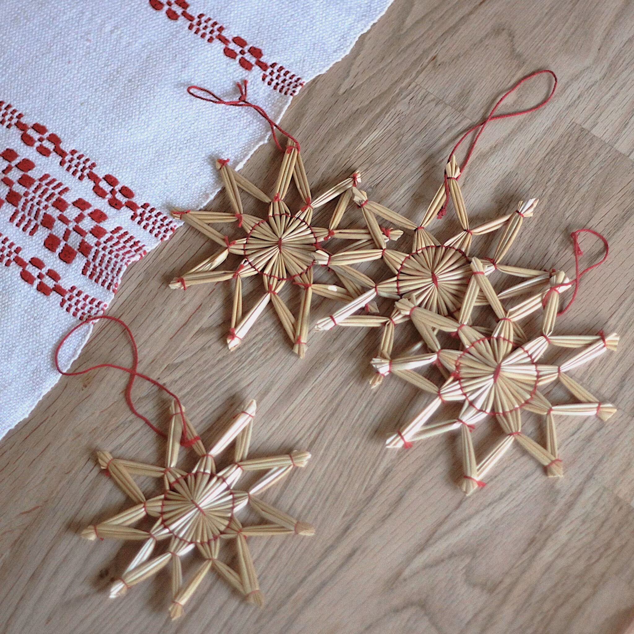 Vackert äldre julpynt i halm. Detta är vackra handgjorda prydnader för julgranen, ett tallris eller någon annan plats du kan tänka dej. Dessa stjärnor är ca.10.5 cm långa och de säljs styckvis.