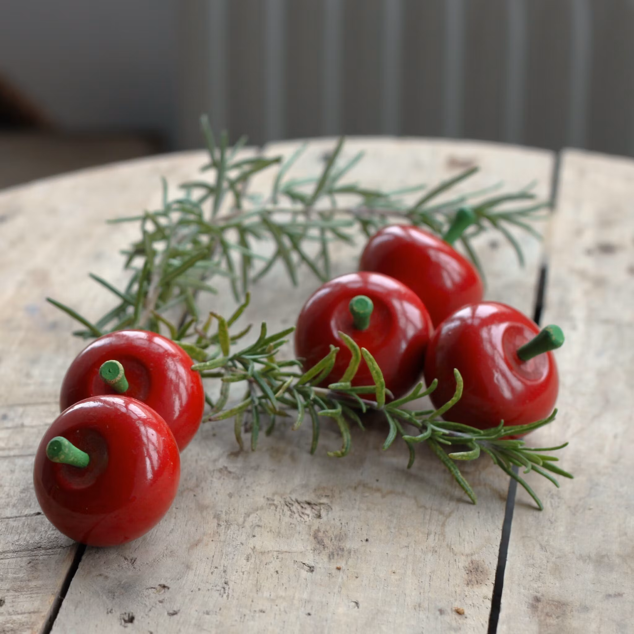 Dekorativt äpple i trä, målat i en röd blank färg. Dessa äpplen är ca. 4cm rakt över och har gröna skaft. Vill du hänga dem i granen fäster du ett snöre eller tråd runt skaftet.