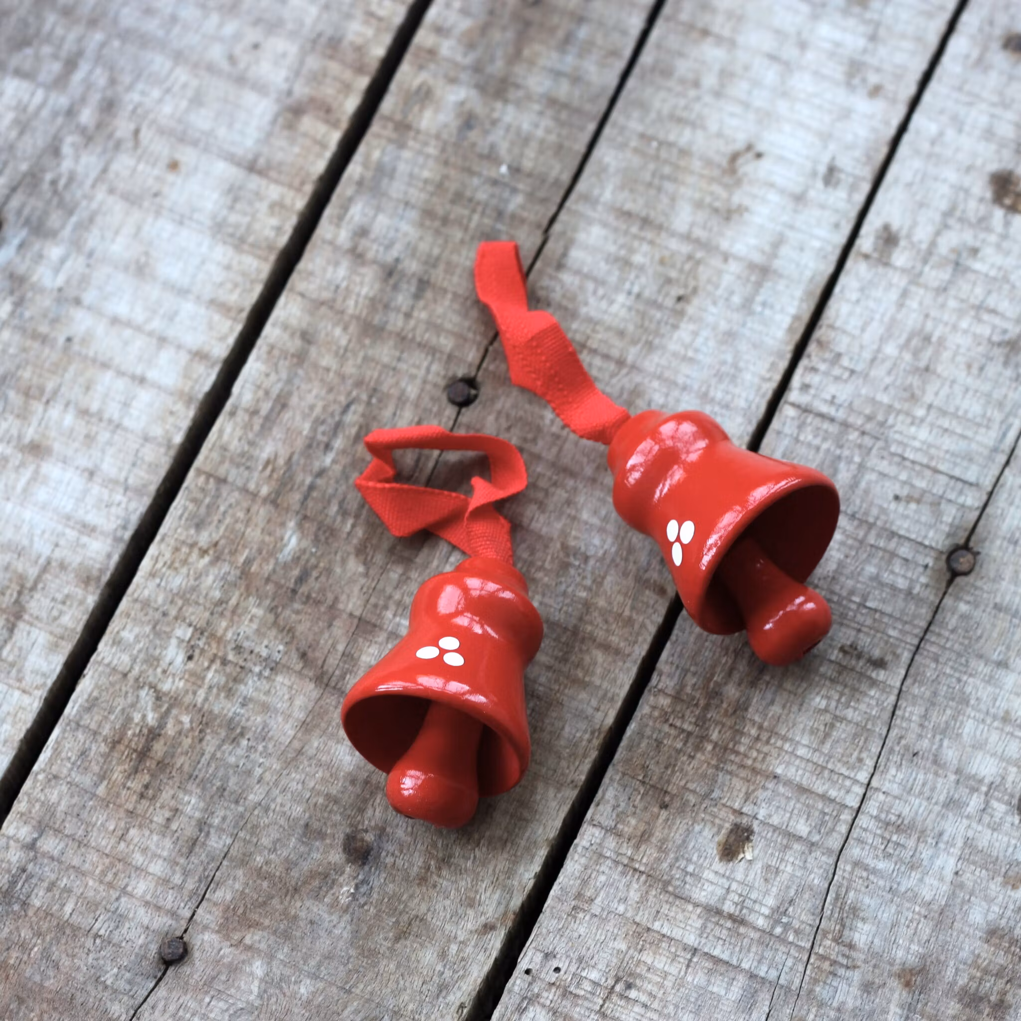 Fint lite äldre julpynt, rödmålade klockor i trä. Dessa är lika fina i ett tallris hela vintern som i julgranen. Klockorna är ungefär 4cm höga, kläppen oräknad och detta är ett set med 2 klockor.