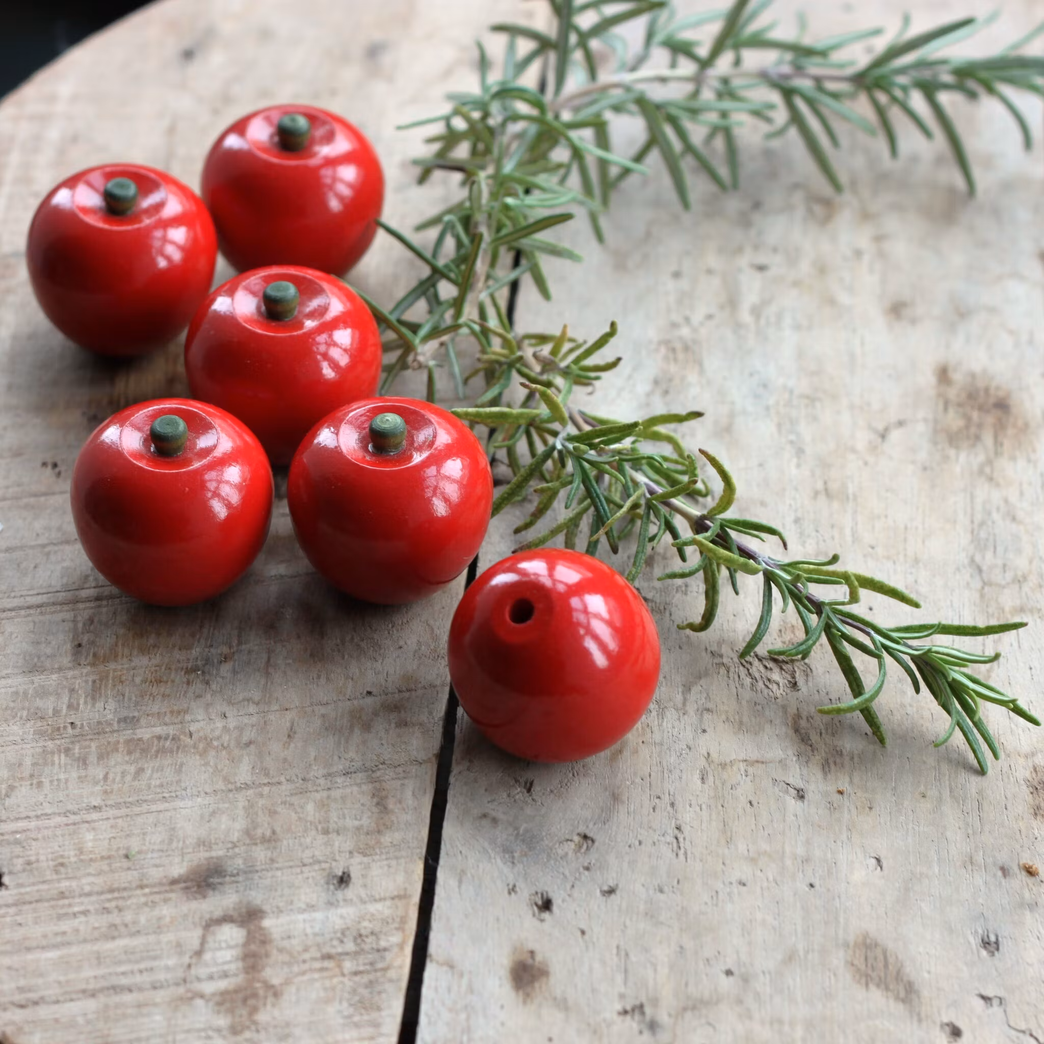 Dekorativt äpple i trä, målat i en röd blank färg. Dessa äpplen är ca. 4cm rakt över och har mörkt bruna skaft. Vill du hänga dem i granen fäster du ett snöre eller tråd runt skaftet. Dessa äpplen har hål i botten och kan fästas på exempelvis en stor Toarpskrona.
