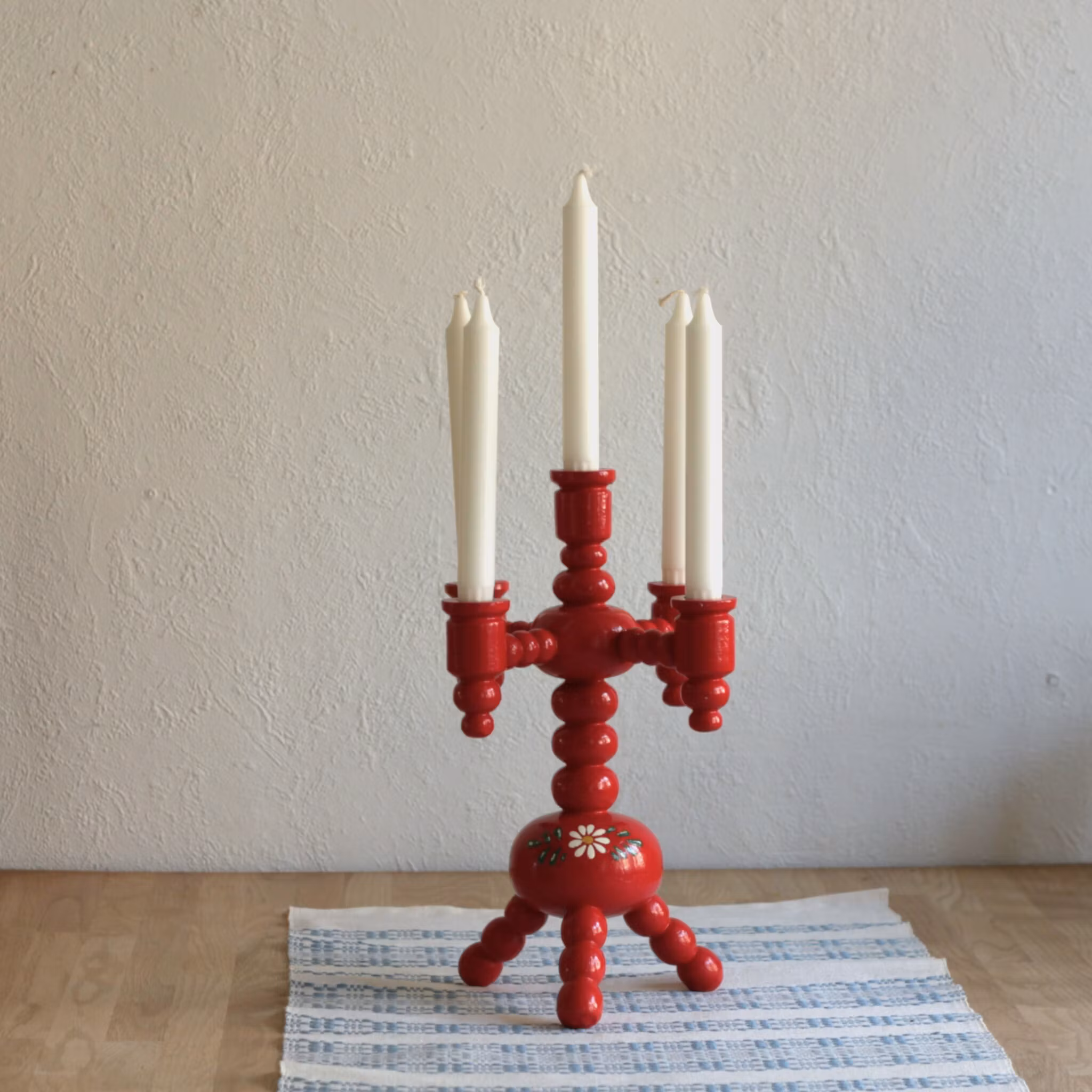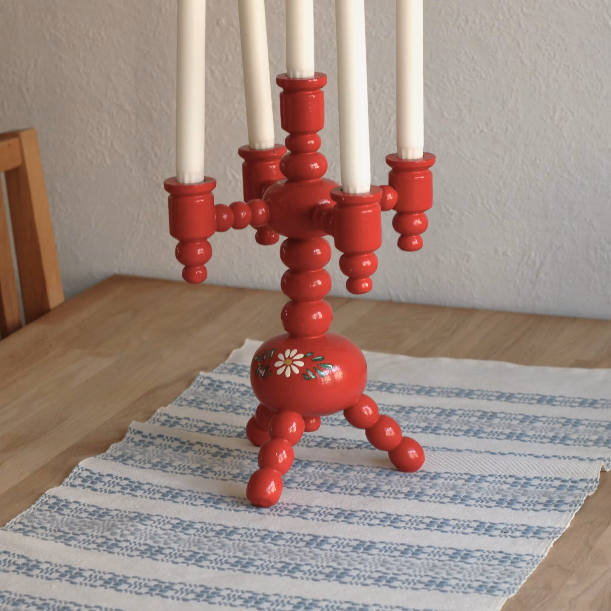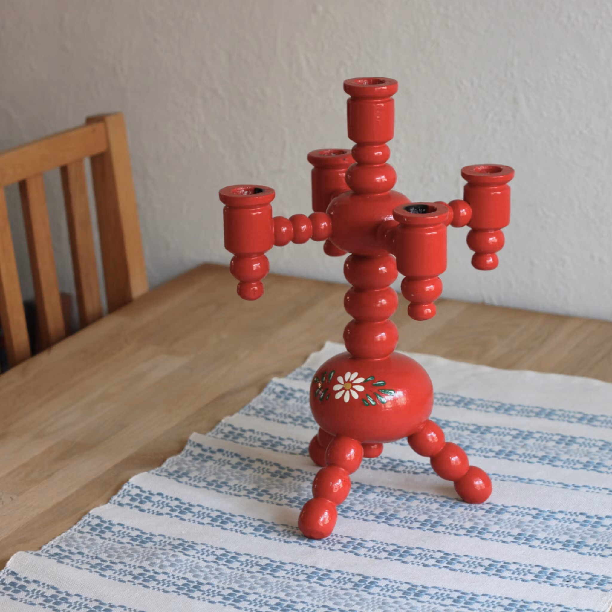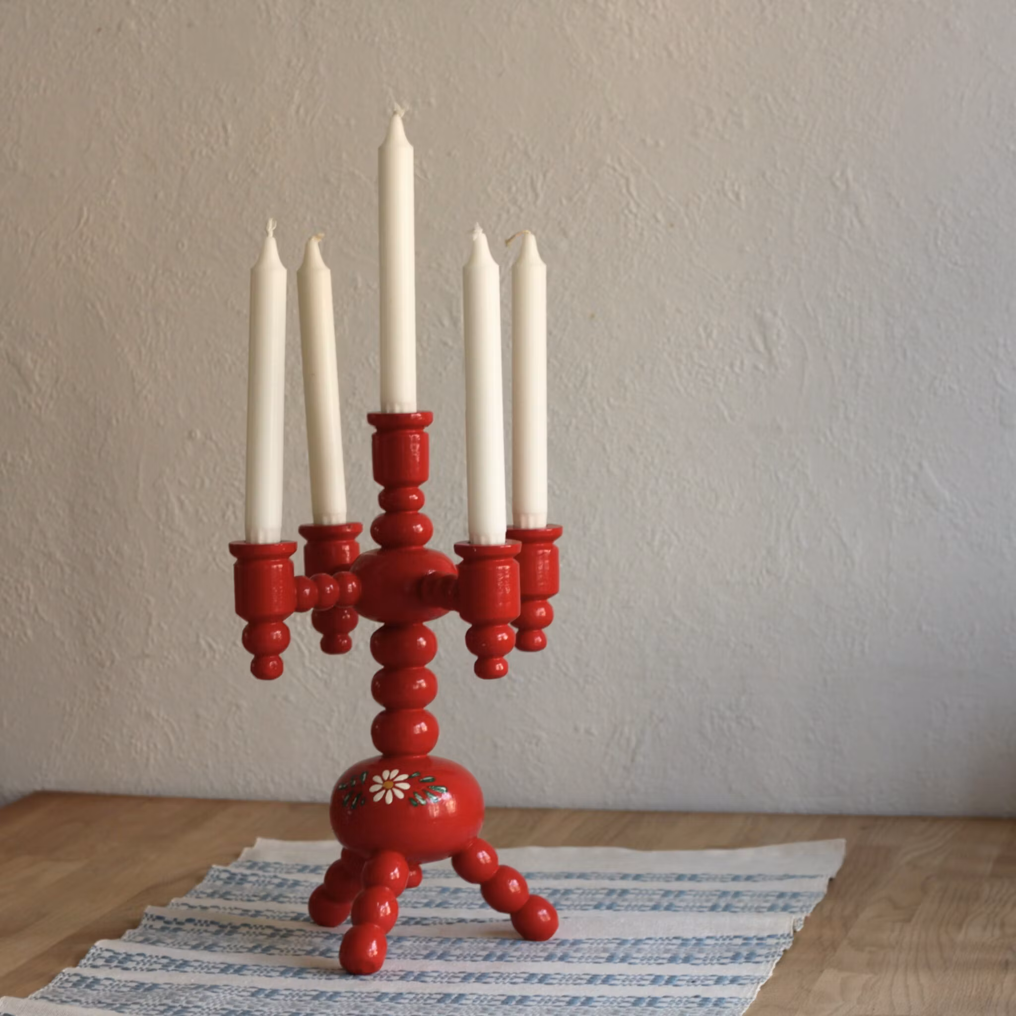 En fantastik och rejäl ljusstake i rödmålat trä med fina målade blommotiv. Ljusstaken som har hållare för fem antik- eller kronljus är hela 34cm hög. Denna fina pjäs gör sig väldigt fint mitt å ett dukat julbord eller vid sidan av helgens gottebuffe. Ljusstaken har en liten svärta vid te av ljushållarna och det funkar absolut lika bra att sätta batteriljus i den, om den ska stå så att barn och dur kan komma åt den.