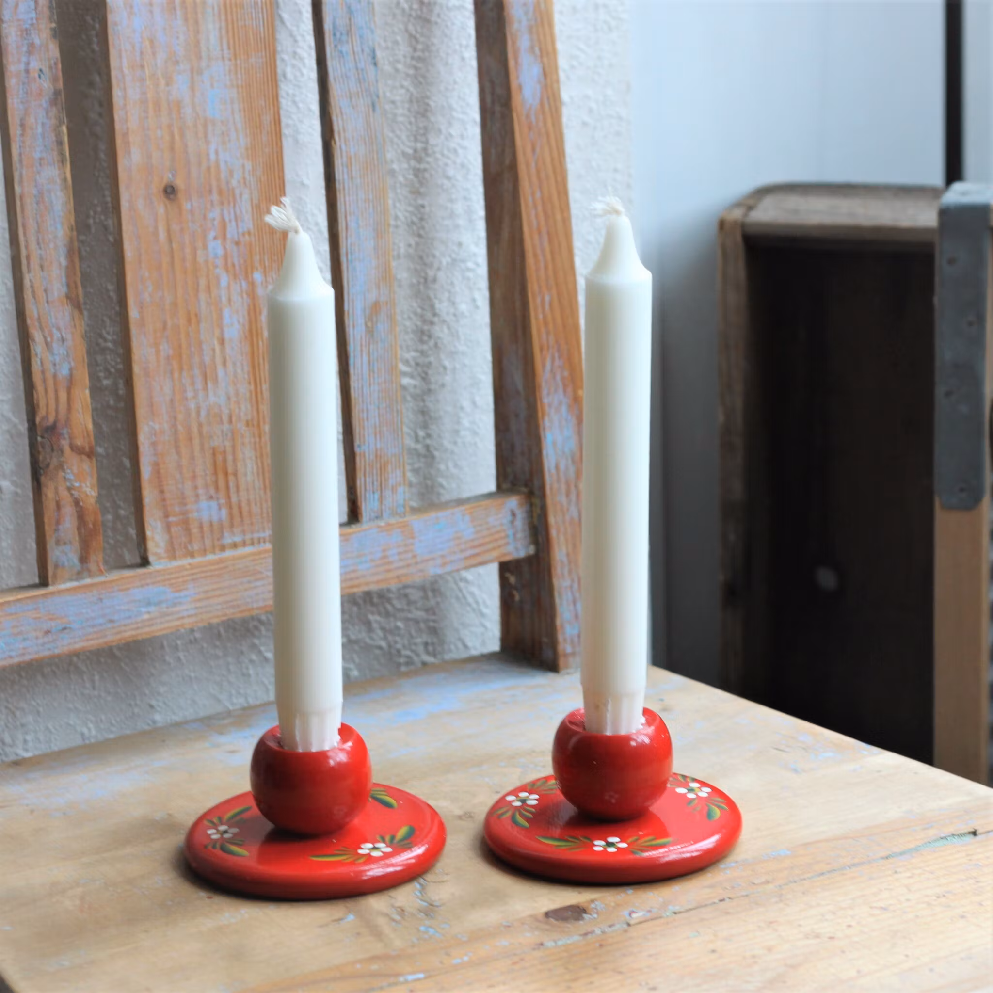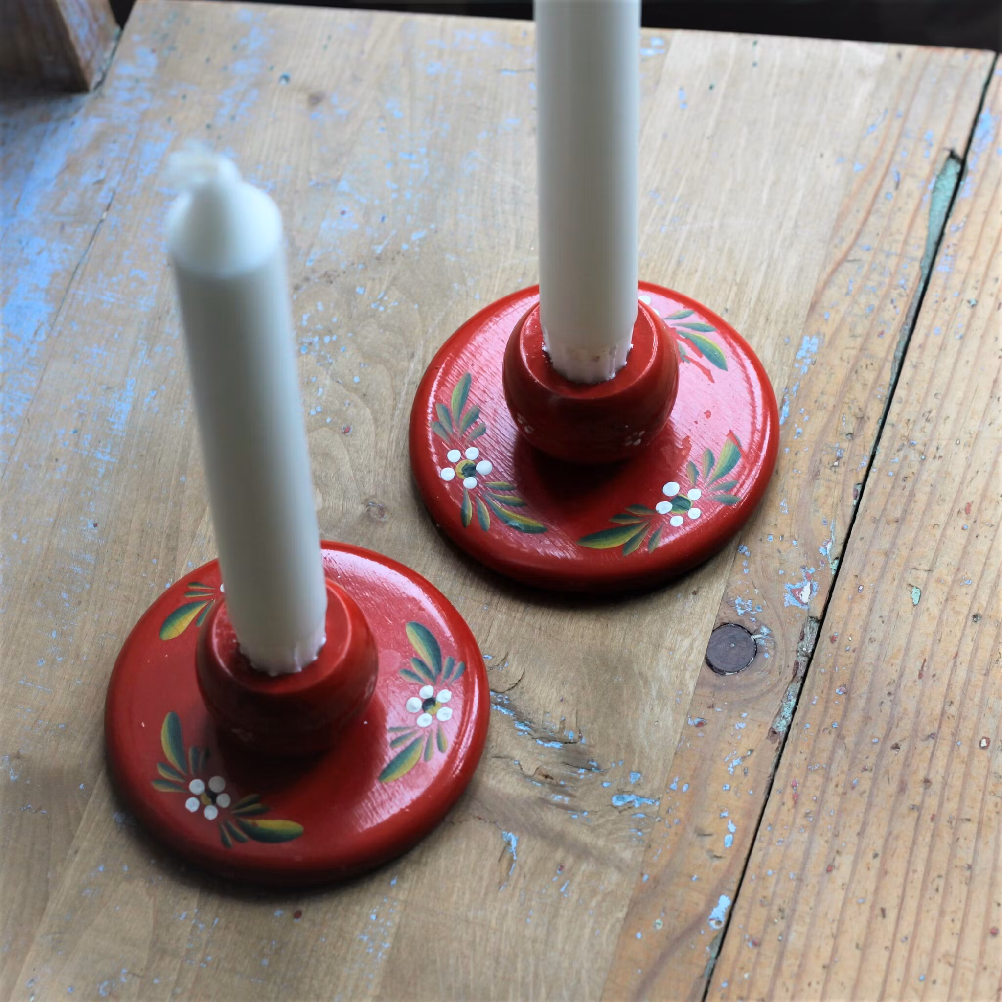 Ett par dvs två rödmålade ljusstakar i trä. Ljushållarna är lagom för antik- eller kronljus.