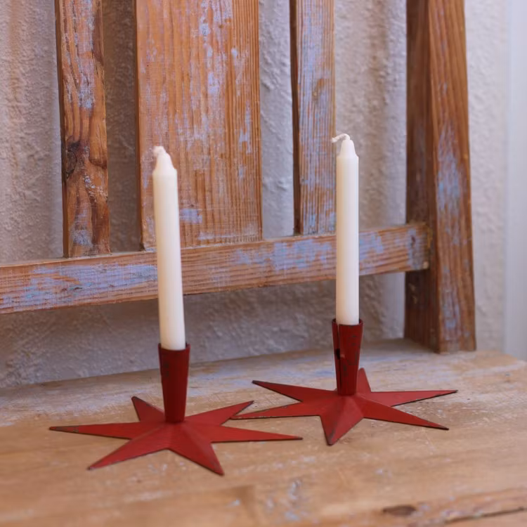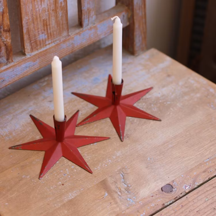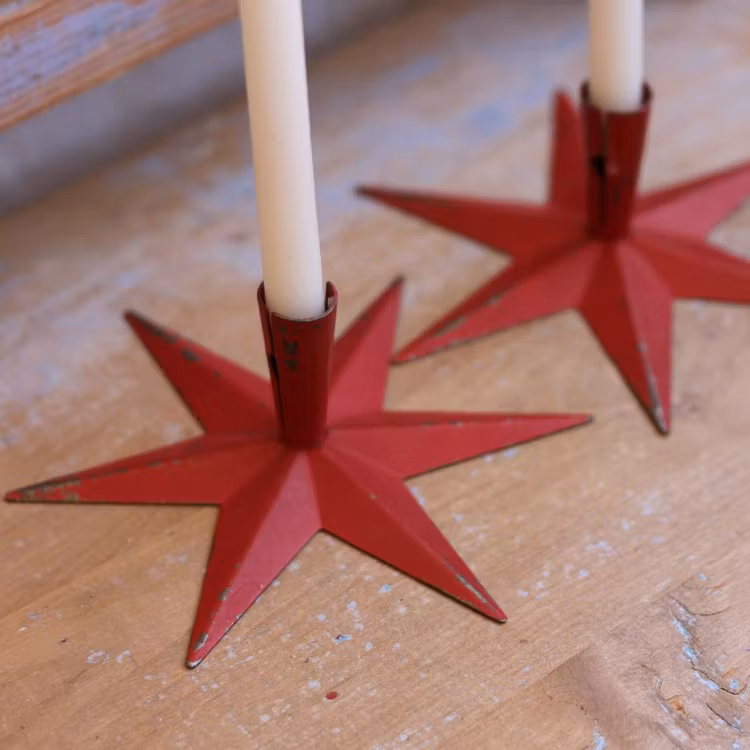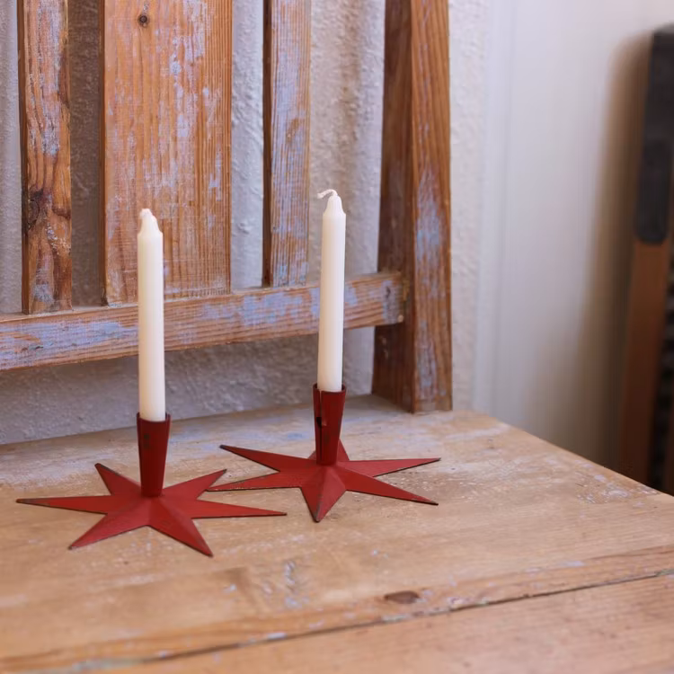Ljuvliga äldre ljusstakar i rödmålad metall som fått en fin patina över åren. Dessa är för ljus i storlek med "julgransljus". Om en vill kan en absolut ha dessa framme året om. Detta är alltså ett par så det är två (2) ljusstakar.