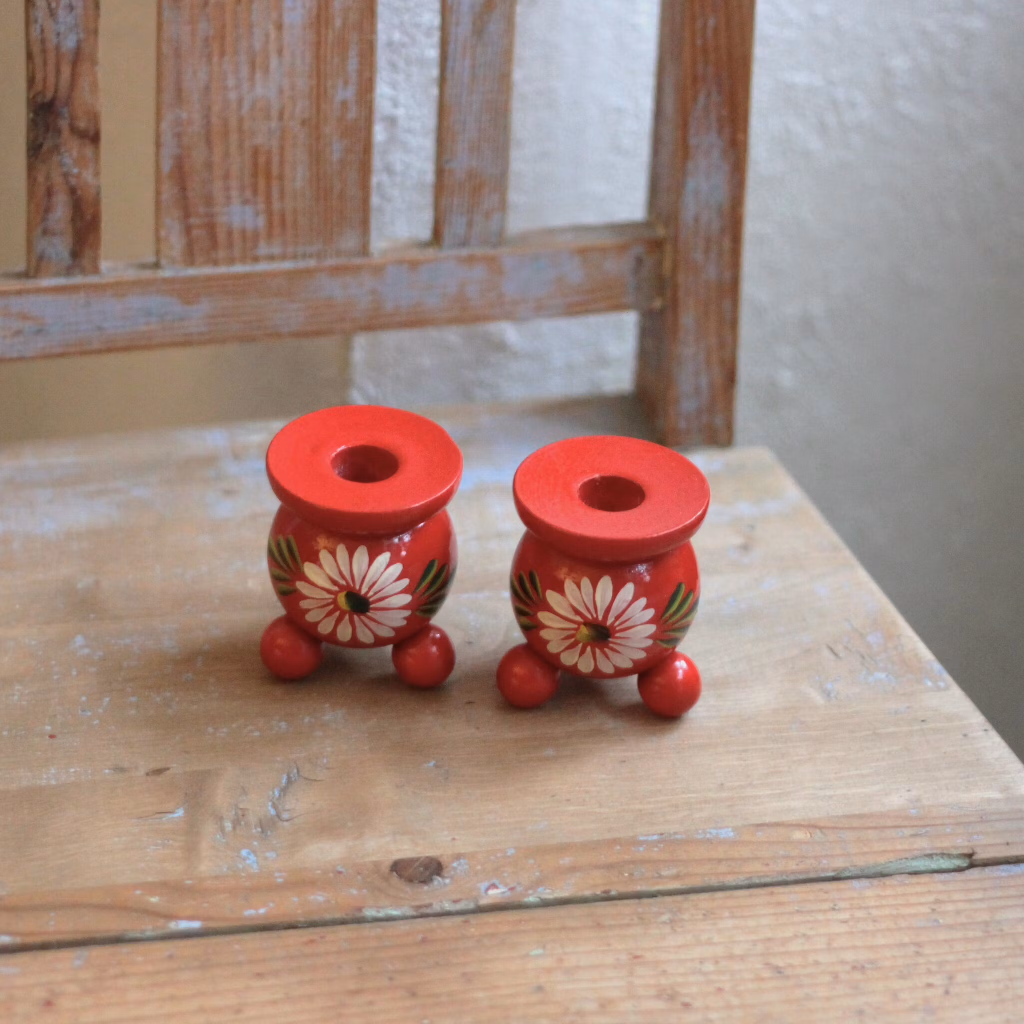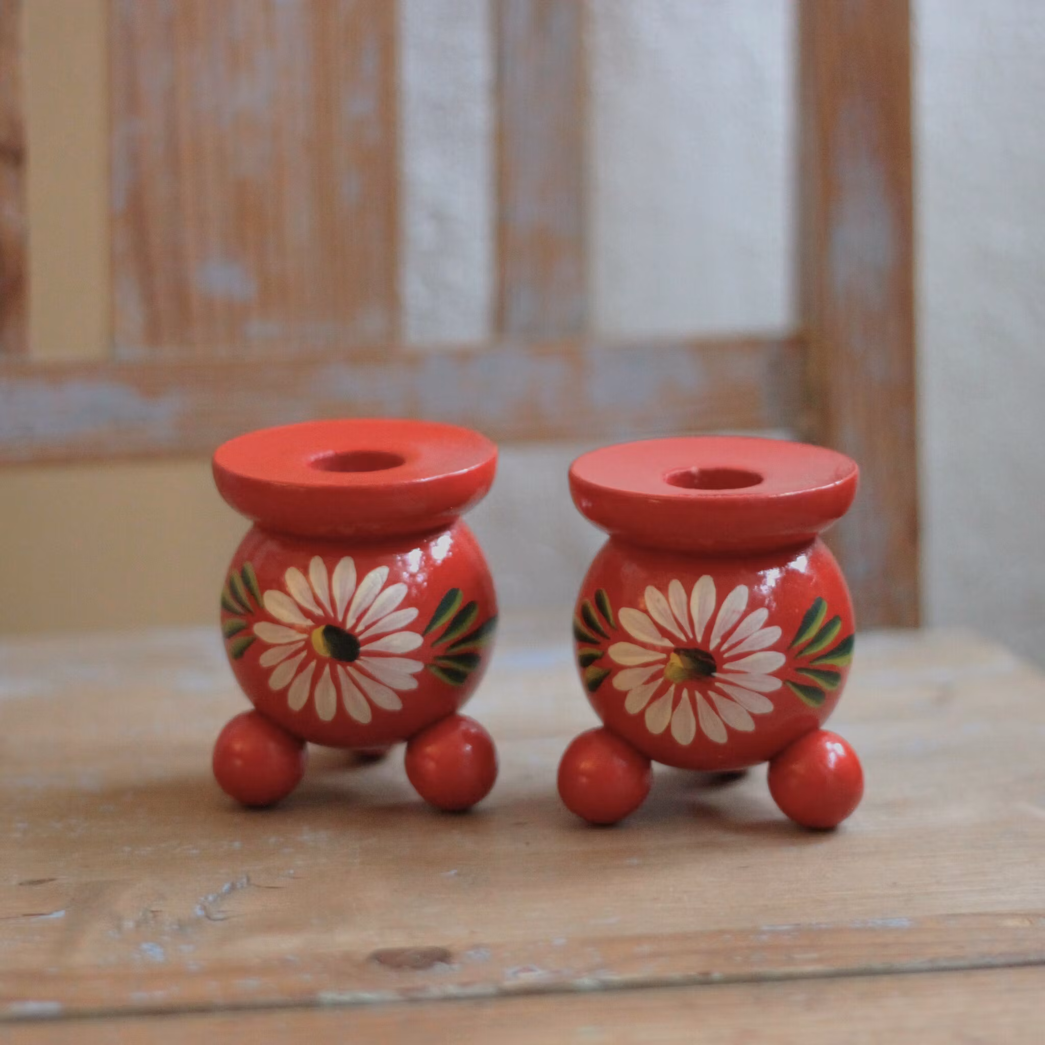 Röd klassisk "kulljusstake" lagom stor för ett något smalare ljus antikljus, passar fint in i de flesta hem. Denna röda träljusstake är fint målad med blommotiv.