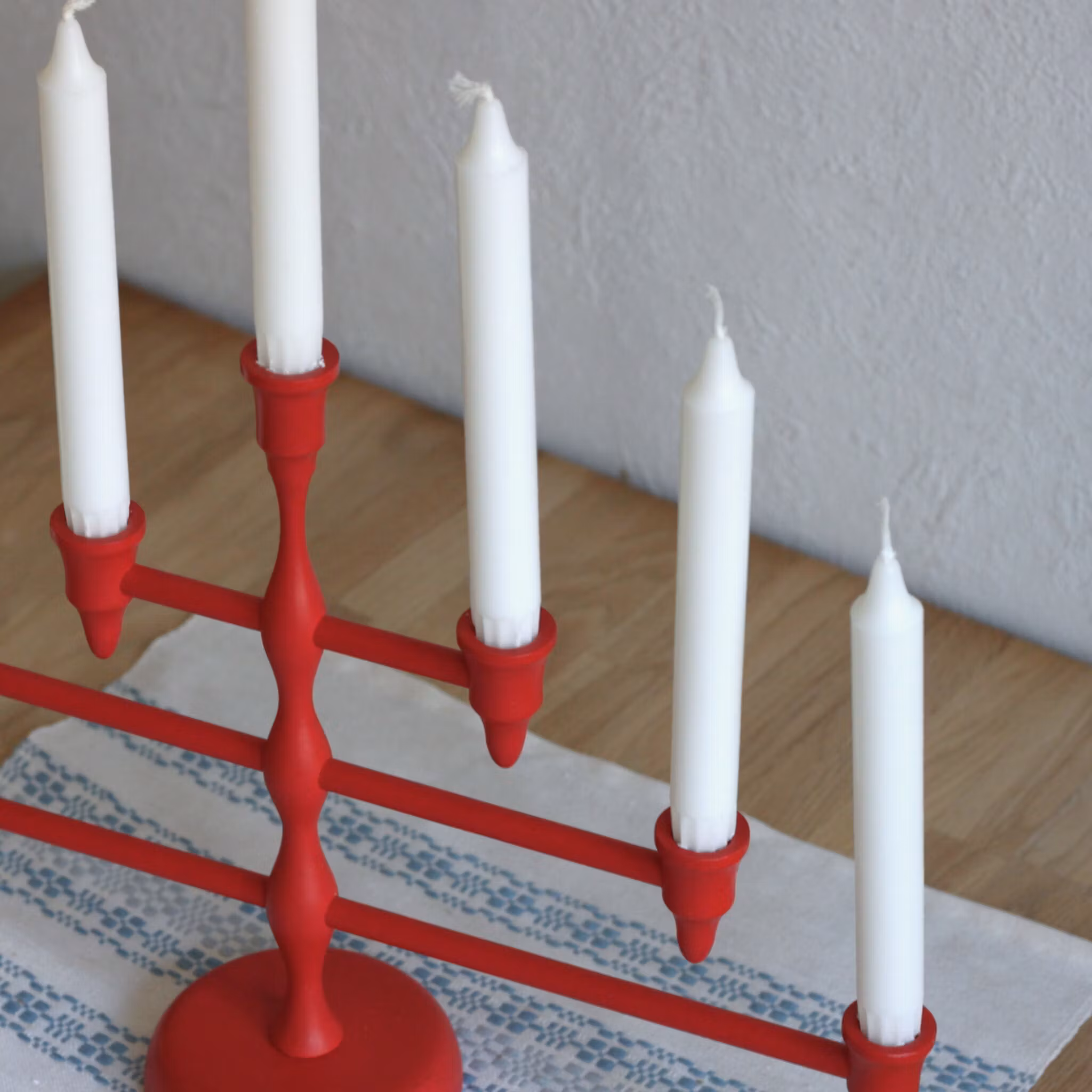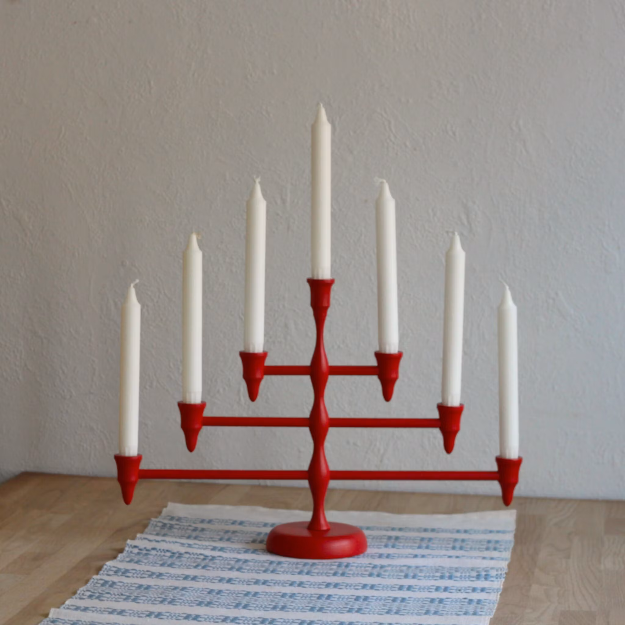 Stor röd ljusstake i målat trä med hela sju ljushållare för antik- eller kronljus. Denna fantastiska ljusstake är ungefär 31cm hög och hela 47cm bred.