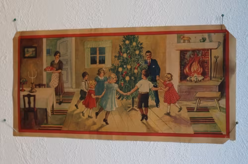 Ljuvlig äldre pappersbonad att ha på väggen i jultid. Just denna är tryckt på matt papper. Motivet är av Jenny Nyström och bonaden är ungefär 17.5x39cm.