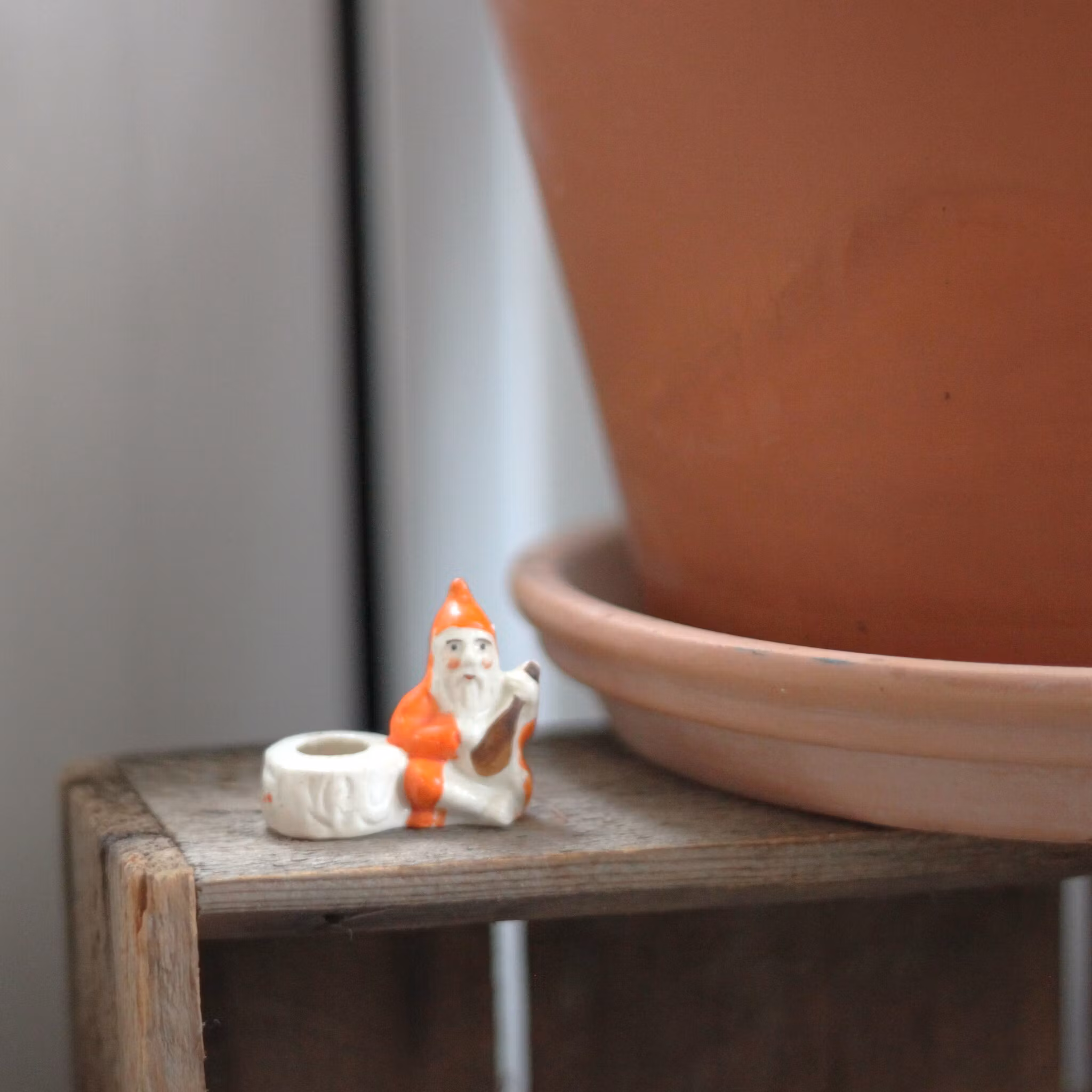 Pytteliten sittande tomtegubbe med musikinstrumentoch ljushållare för julgransljus.