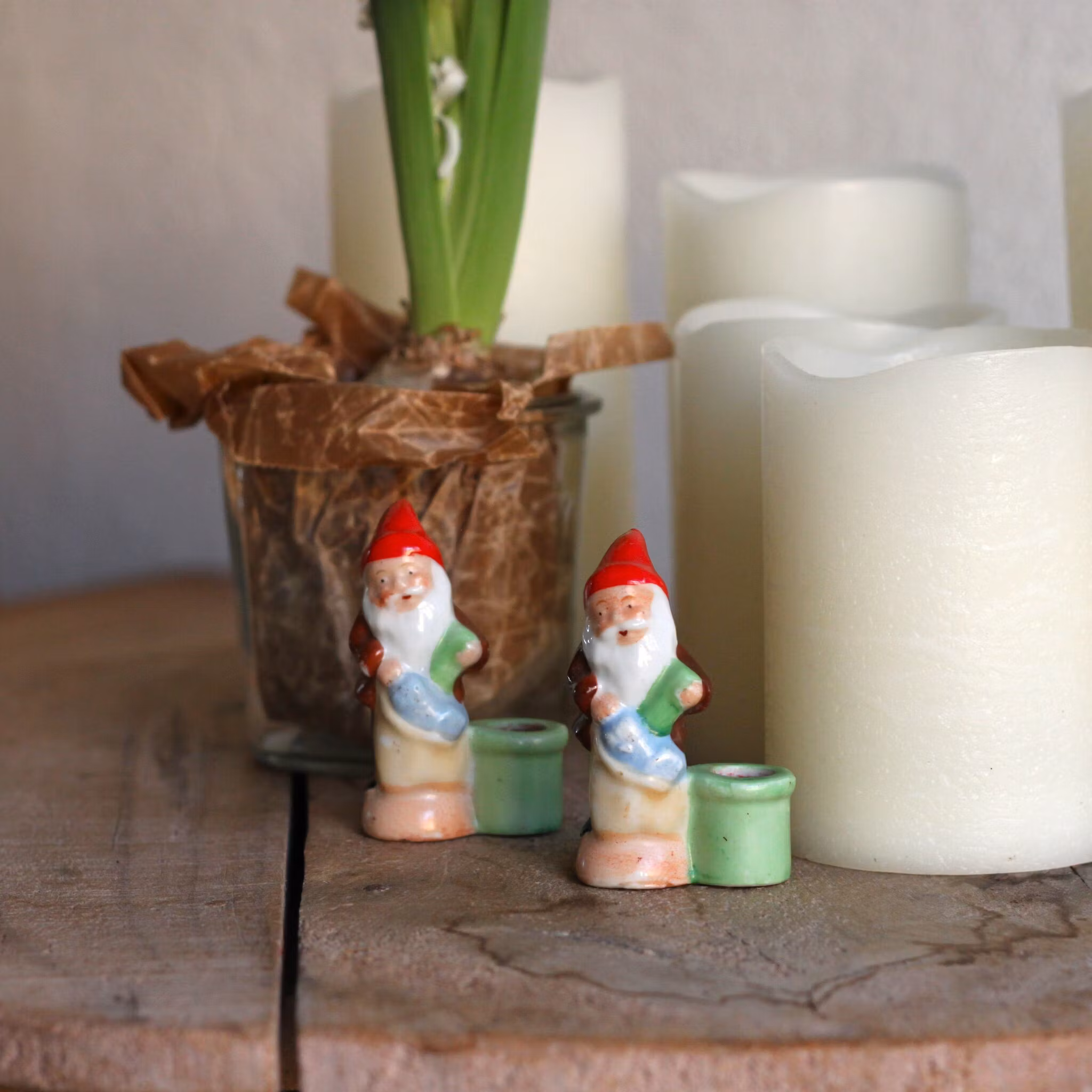 Stående tomte med ljushållare för julgransljus i den ljust gröna cylindern.
