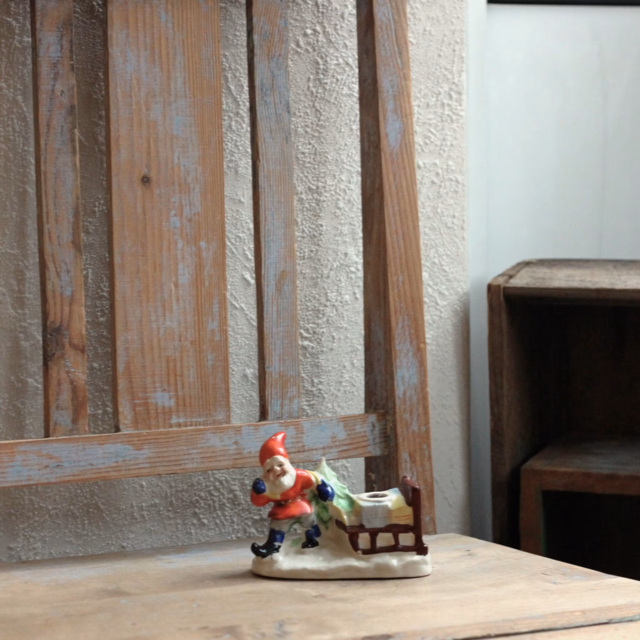 Tomte med ljusstake för julgransljus. Tomten drar en kälke med paket på, bakom sig och uppe på den sitter ljushållaren.
