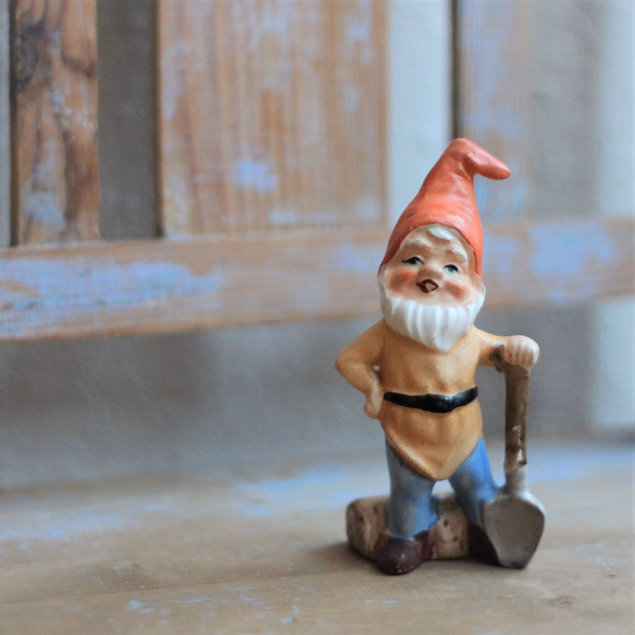 Tomte med spade, nästan 11cm hög. Tomten som står med en spade är tillverkad i porslin och har en lite matt lyster.