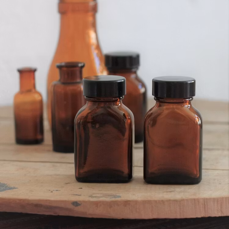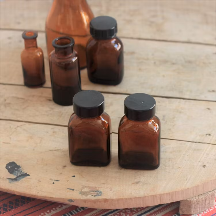 Liten fin flaska i brunt glas, att dekorera med eller kanske ha som vas till en liten söt bukett blommor. Flaskan som är i en varm brun nyans är ca 7cm hög, bakelitlocket medräknat.