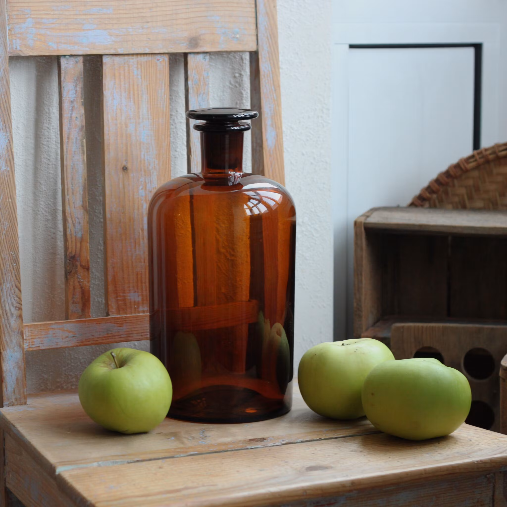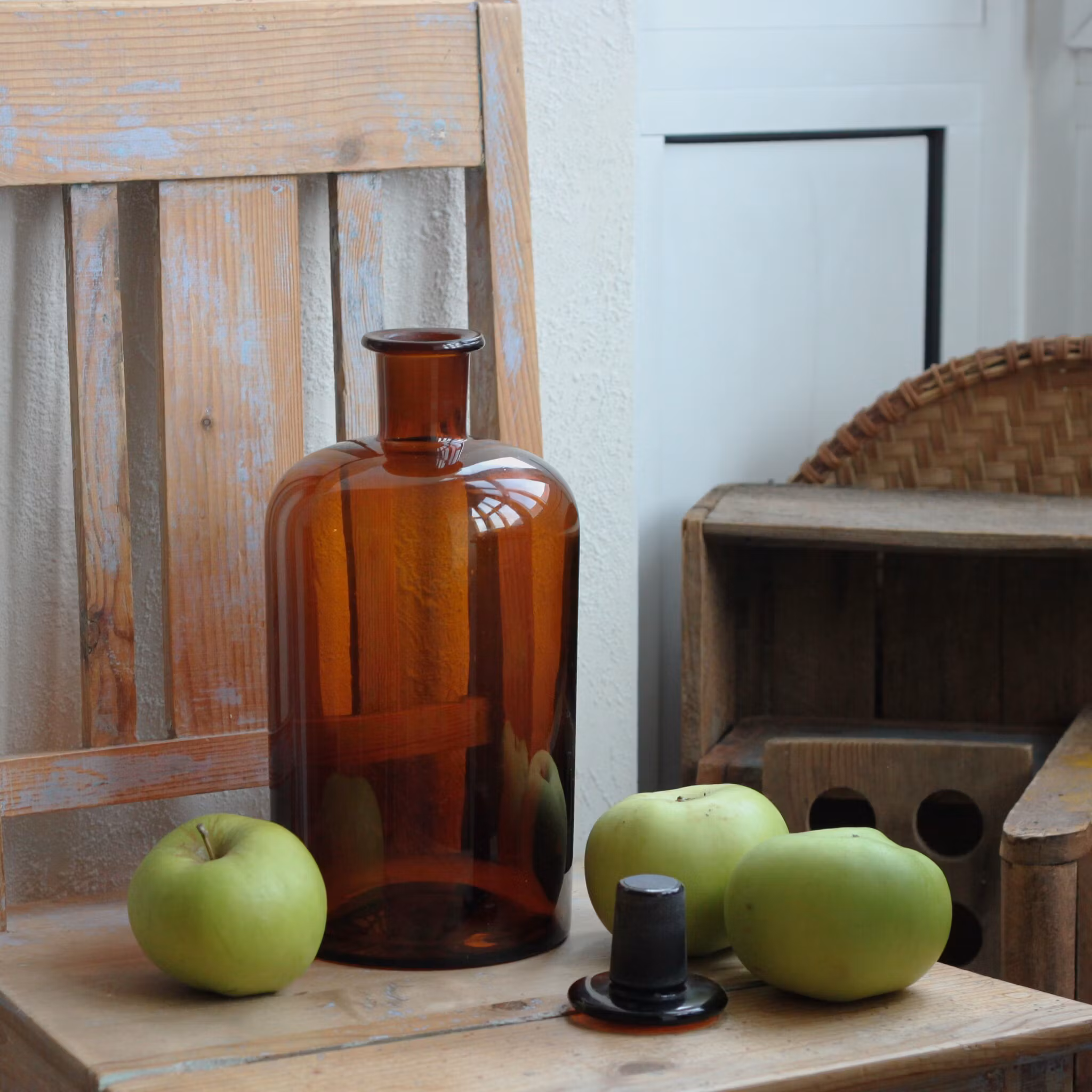Stor fin och rejäl apoteksflaska, hela 27cm hög med kork i. Flaskan som är i en rödbrun nyans som ofta kallas amber är ett vackert blickfång men funkar absolut som vas med.