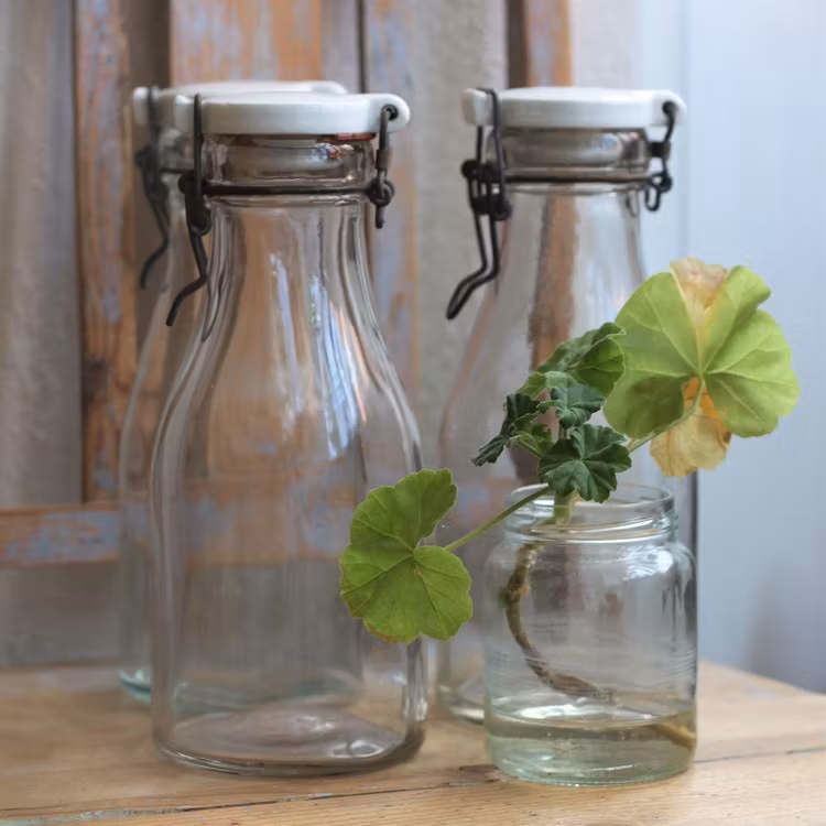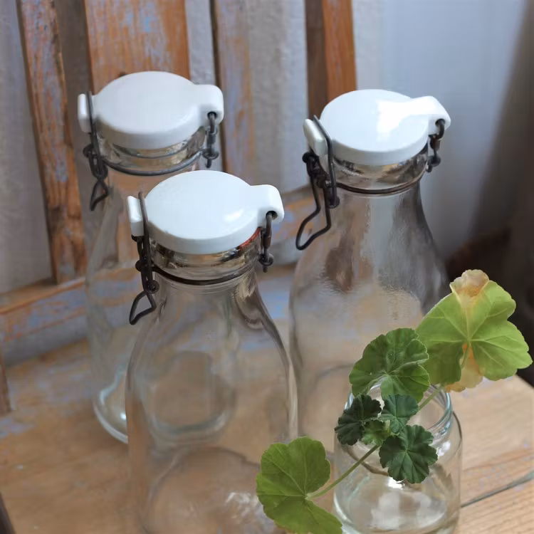 Flaska i en äldre modell, vanligen använd till mjölk och grädde. Det finns flera varianter inne i butiken, både vad det gäller storlek på själva flaskan, om det är porslins- eller glas-lock samt färg på glaset. Denna flaska är ca 24cm hög och i ofärgat glas med vitt porslinslock.