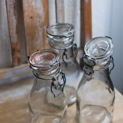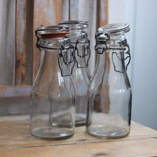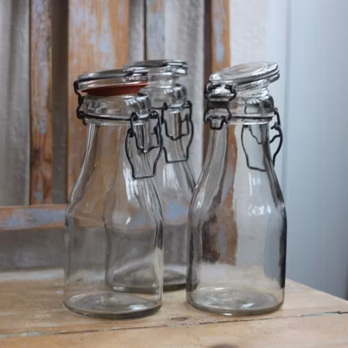 Flaska i en äldre modell, vanligen använd till mjölk och grädde. Det finns flera varianter inne i butiken, både vad det gäller storlek på själva flaskan, om det är porslins- eller glas-lock samt färg på glaset.