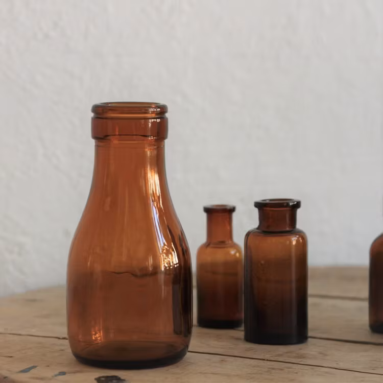 Liten fin flaska i brunt glas, att dekorera med eller kanske ha som vas till en liten söt bukett blommor. Flaskan som är i en varm brun nyans är ca 12.3cm höga och priset avser en flaska.