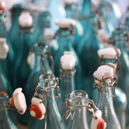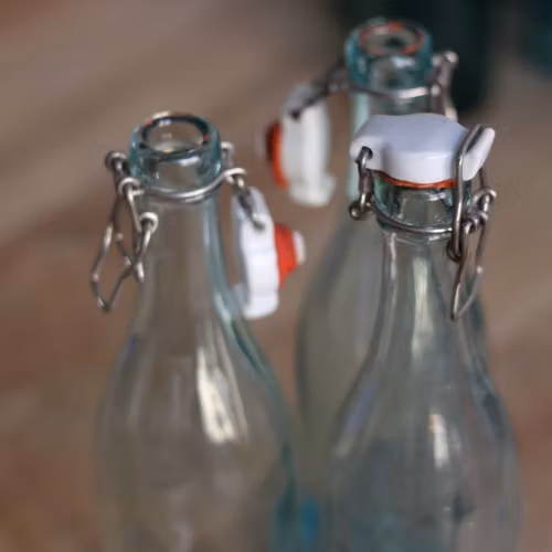 Flaska i en lite mindre storlek 33cl, ungefär samma som nyare läskflaskor i glas. Det finns flera varianter inne i butiken, denna är av typen "ljus" dvs det är flaskor i ett lite ljusare glas. På många av flaskorna sitter den gamla gummipackningen kvar, antingen hel eller i bitar. Vi rekommenderar att man byter ut den om man ska ha saft eller annan dricka i flaskan. Dessa flaskor har en handgjort känsla och köper man flera så gör vi vårt bästa för att hitta flaskor som passar ihop både vad det gäller färg och höjd.